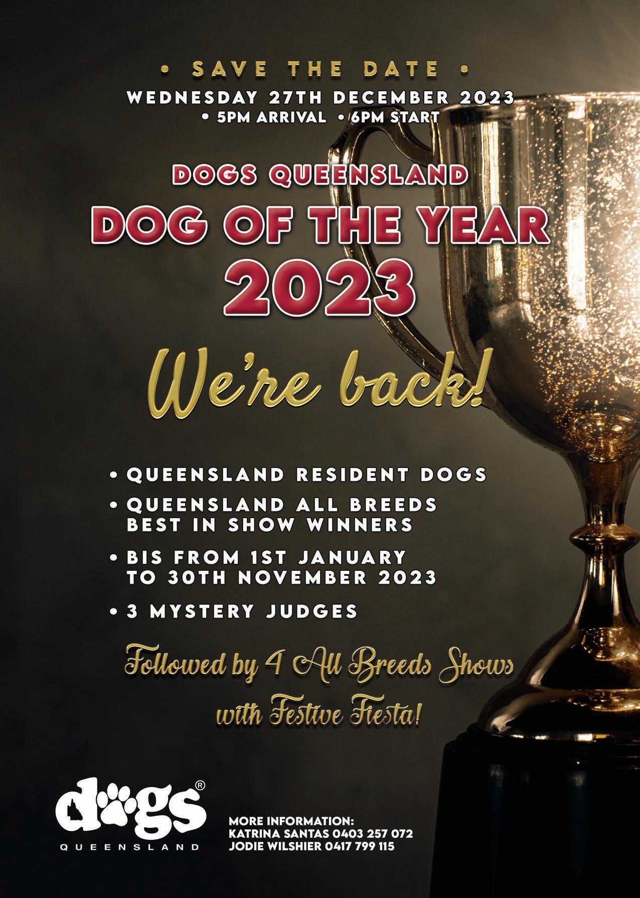 After much deliberation and the previous cancellation of the 2022/23 DOTY competition, the current PR and Marketing Committee are excited to offer the Dog of the Year Final for 2023, in the lead up to the Festive Fiesta shows, to be held on the evening of Wednesday, 27 December 2023 commencing with attendance acknowledgement at 5pm for a 6pm start to the head to head heats.