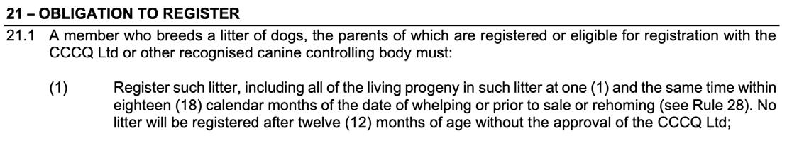 Members are reminded that the obligation to register all living progeny in a litter is within 12 months, after which time approval must be sought. When puppies are sold, transfers must take place within 30 days. Rules 21 (Obligation To Register) and 28 (Transfers) should be read in conjunction with each other.