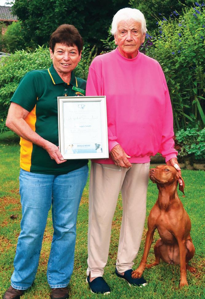 Congratulations to member Magda Smyth, who was awarded the Distinguished Service Award earlier this year. Magda is a long term active member of the Eurobodalla Canine Club, being a founding member since its commencement in 1993, and her contributions to the sport of Obedience, together with her dedicated service to the Club have earned her this award. Please see the opposite page for more details.
