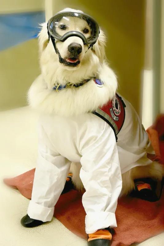 Opposite page (left): Sampson the Service Dog in full PPE © Joey Ramp