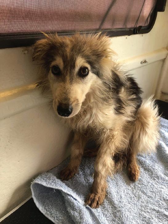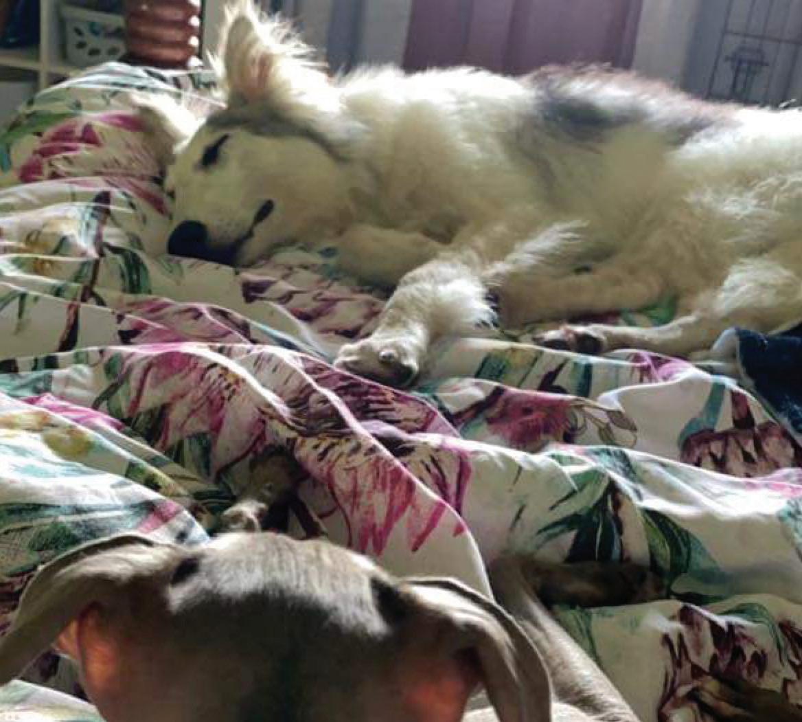 Opposite page - Top Left: Mookie’s first meeting with his family. Top Right: Wilbur sleeping on his new Mum’s bed with his Italian Greyhound sibling. Middle Left: Freya with her new owner. Centre: Wilbur enjoying his new backyard. Middle Right: Wilbur working at his new Mum’s grooming salon. Bottom Left: Inka exploring her new garden. Bottom Right: Rose & Tiny after several baths and some good food. DNA Testing results of the pups which show the following results: 46.3% Borzoi, 21% Maremma Sheepdog, 18.7% Siberian Husky, 9.3% Silken Windhound, 6.7% Great Pyrenees, health swab side of it shows no apparent health issues.