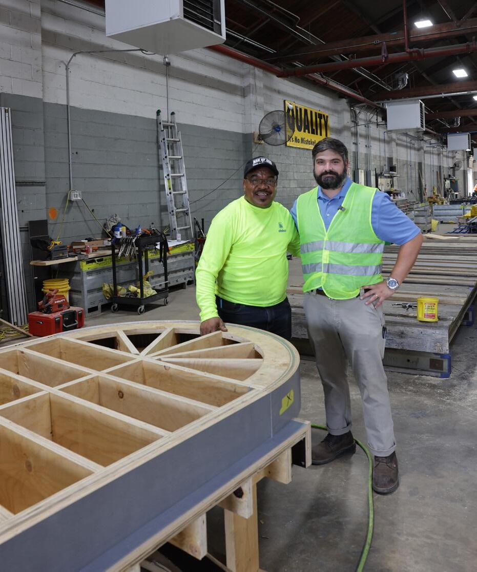 Flying truss tables was one challenge early on. Initially, the construction crew planned to close a lane and fly the trusses, but the city denied the request for a lane closure. The east and west were limited by other structures, so plans were adapted to fly the tables from the south.