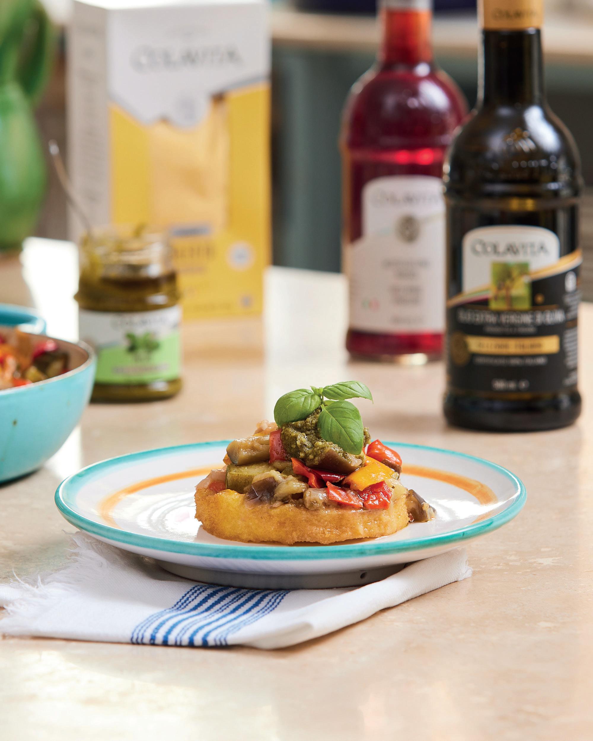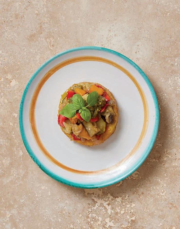 Serve the crispy polenta discs topped with the vegetables, a spoonful of pesto and fresh basil leaves.