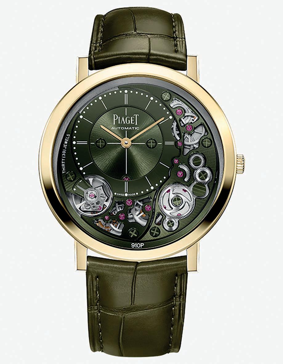 PIAGET’S Altiplano Ultimate Automatic 41 mm watch in 18K yellow gold with green dial, from $41,300, piaget.com.