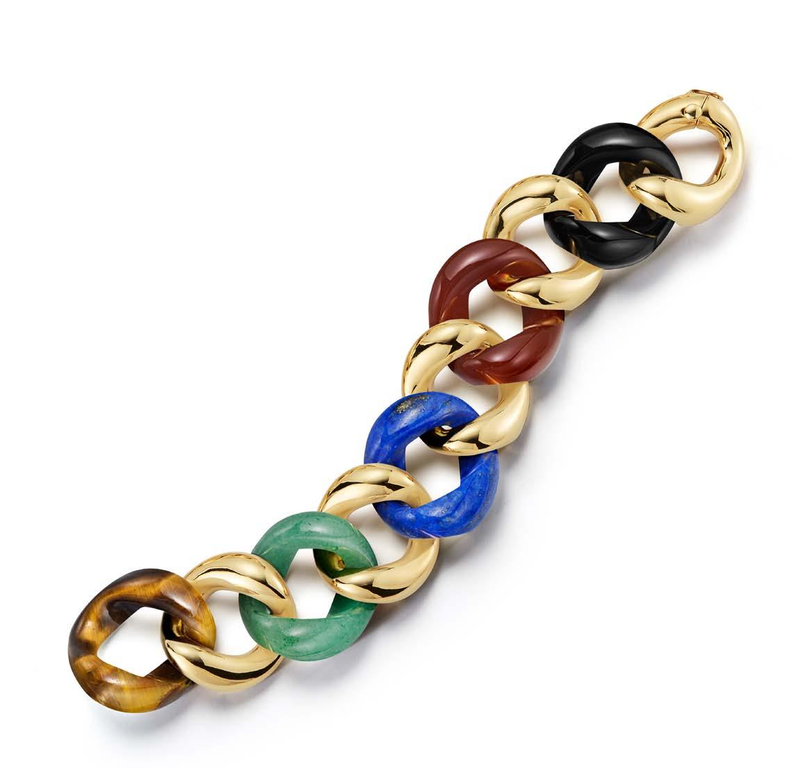 large classic link bracelet in multi stone and 18K yellow gold, $26,000, seamanschepps.com.