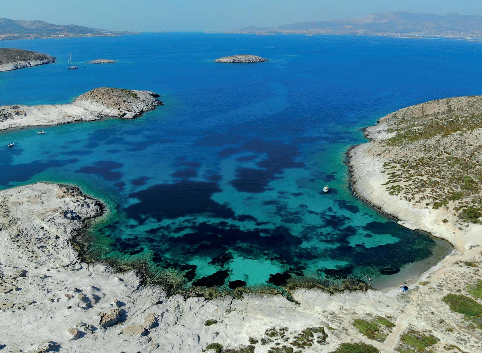 In its southern part, just north of the Sea of Crete, lie The Cyclades. These famous islands are peaks of a submerged mountainous region and a few of them, like Santorini and Milos, were formed by volcanic activity. The name Cyclades stems from the Greek word kúklos (circle) because they seem to extend like a circle around the sacred island of Delos, where the gods Apollo and Artemis were supposedly born. The Cyclades