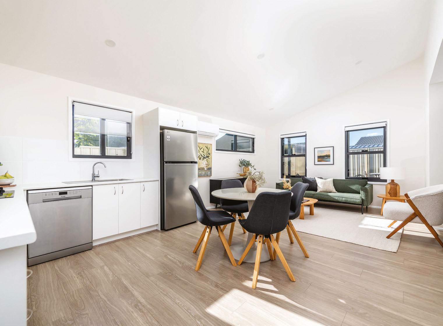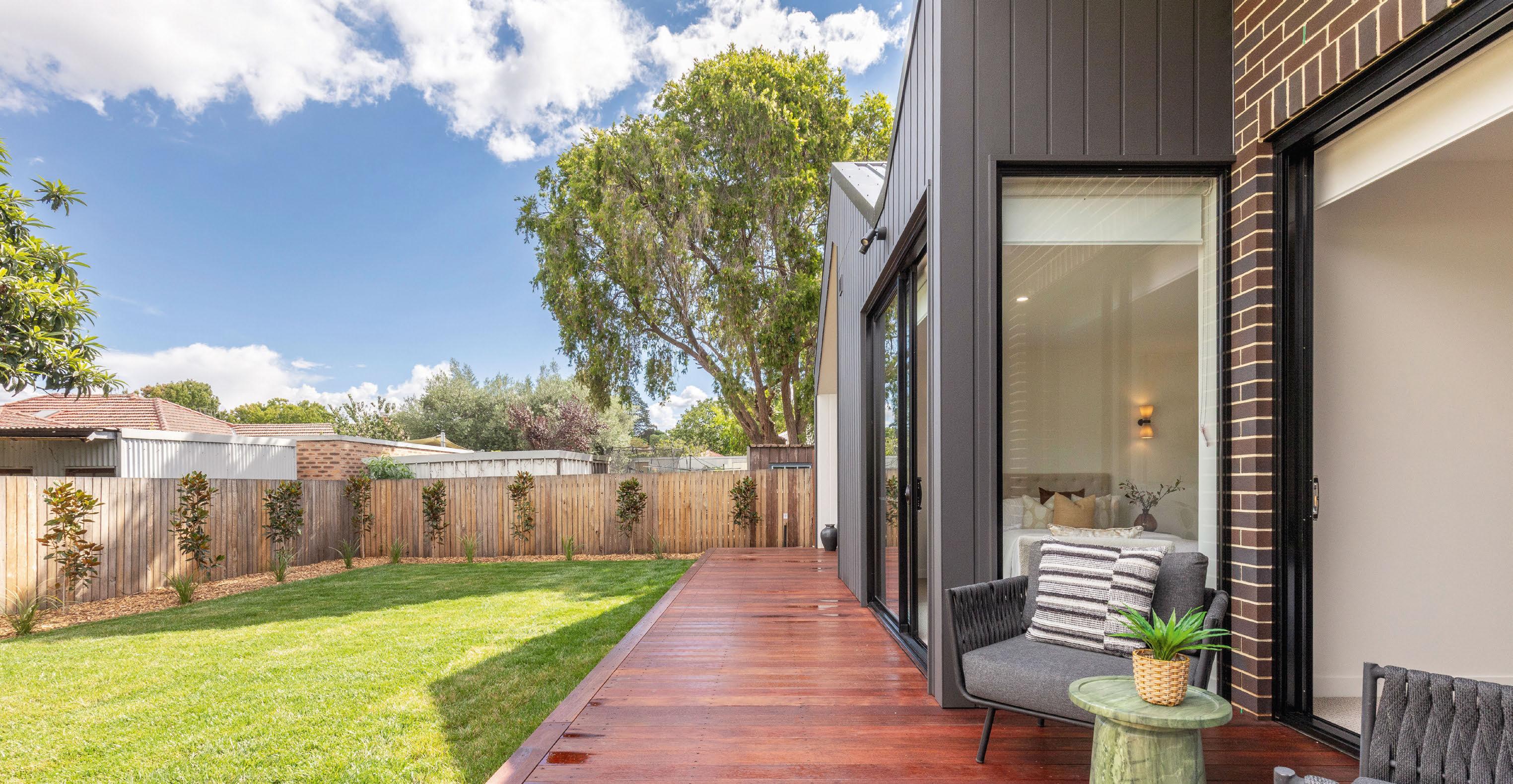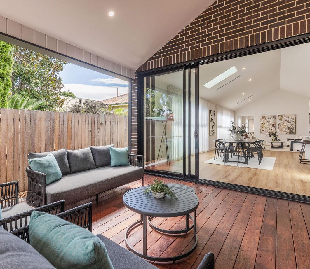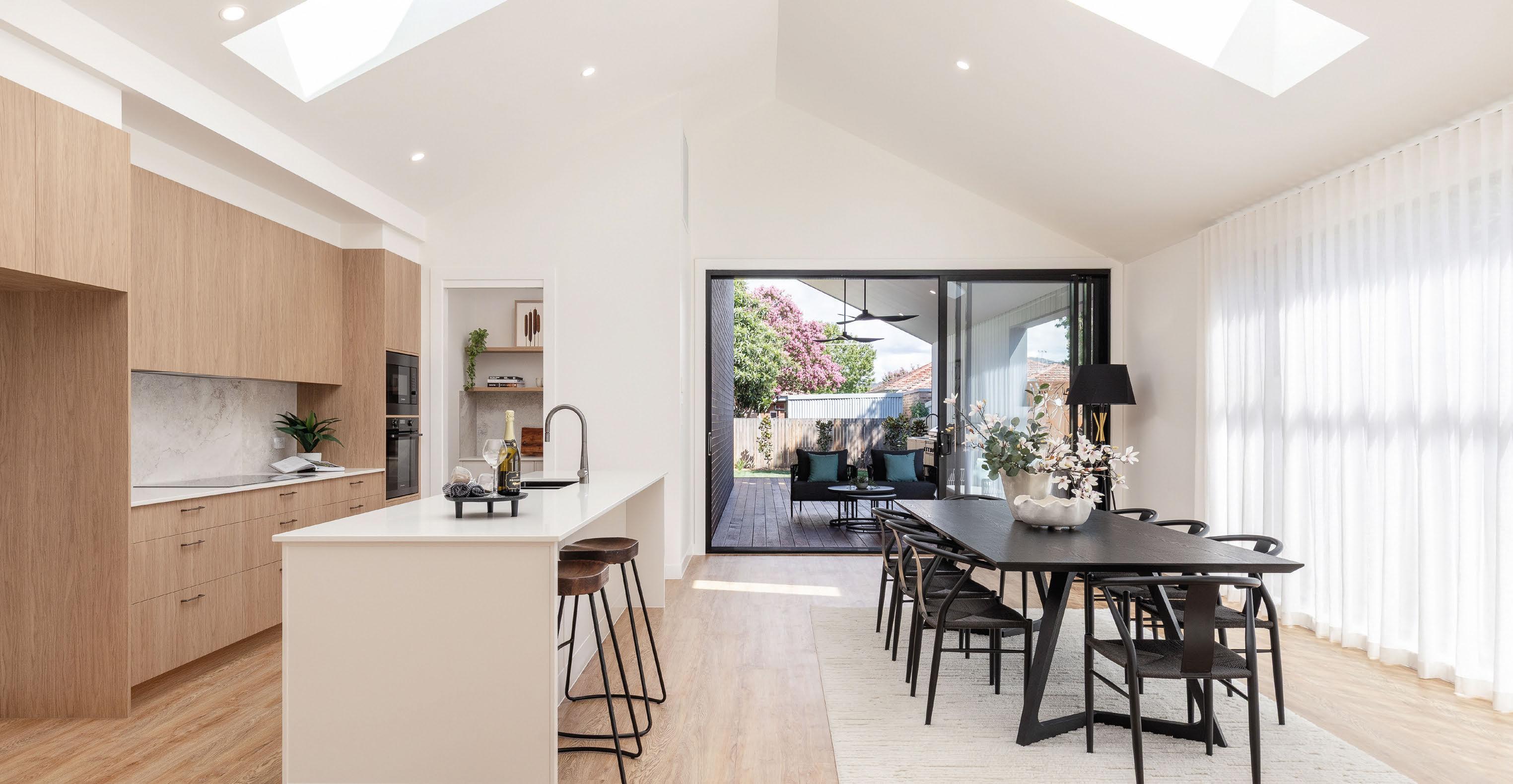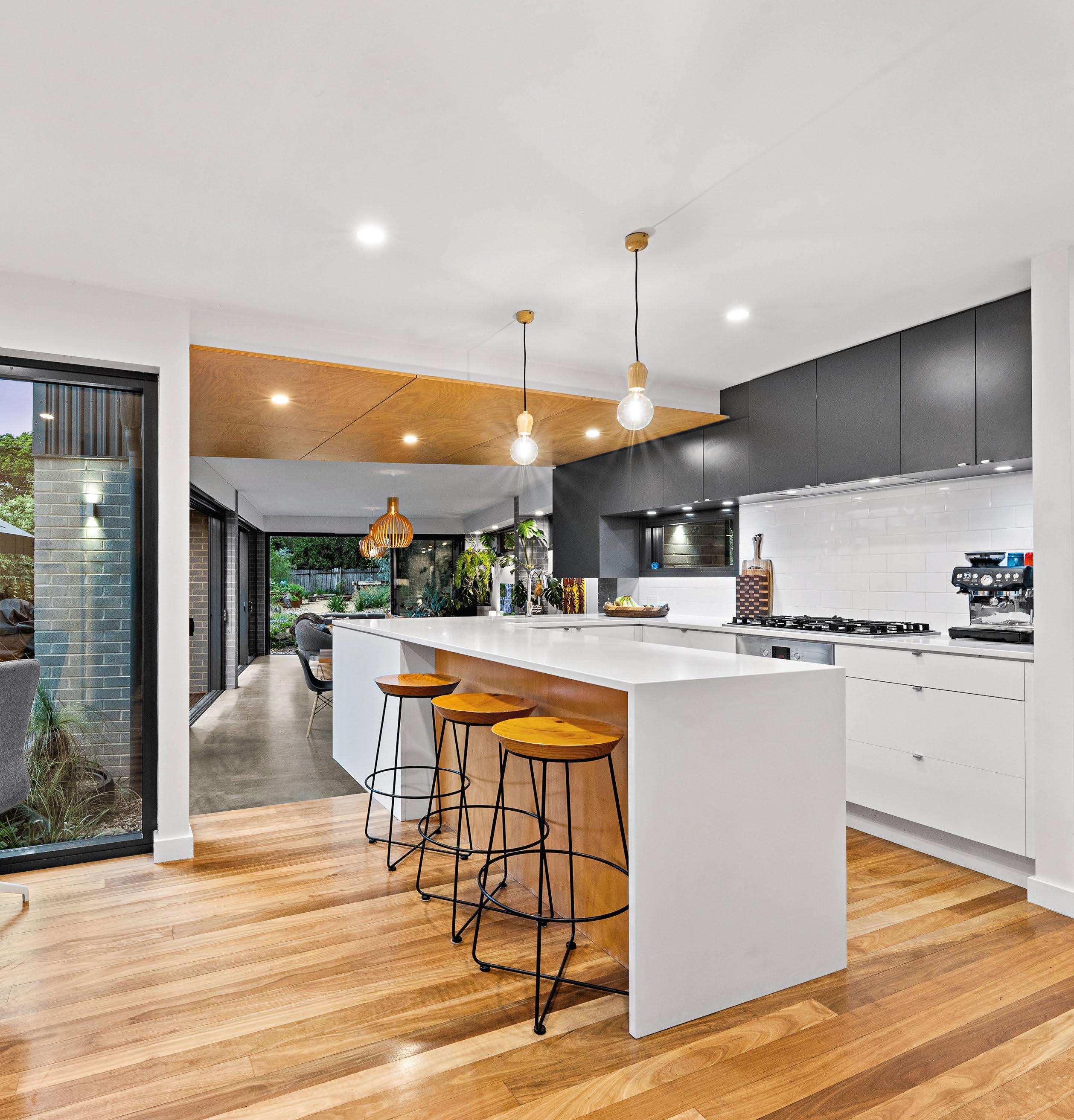 Designed by the renowned Ben Walker Architects, the awardwinning TL House brings together statement design and functional living. The ground foor fows smoothly from front to back, with two living areas and a large kitchen-dining area that opens seamlessly to the outside. Spotted gum foors, polished concrete and custom joinery create texture and warmth. The lowmaintenance native garden is made for entertaining, with timber decks and a fre-pit zone (plus no lawn to mow).
