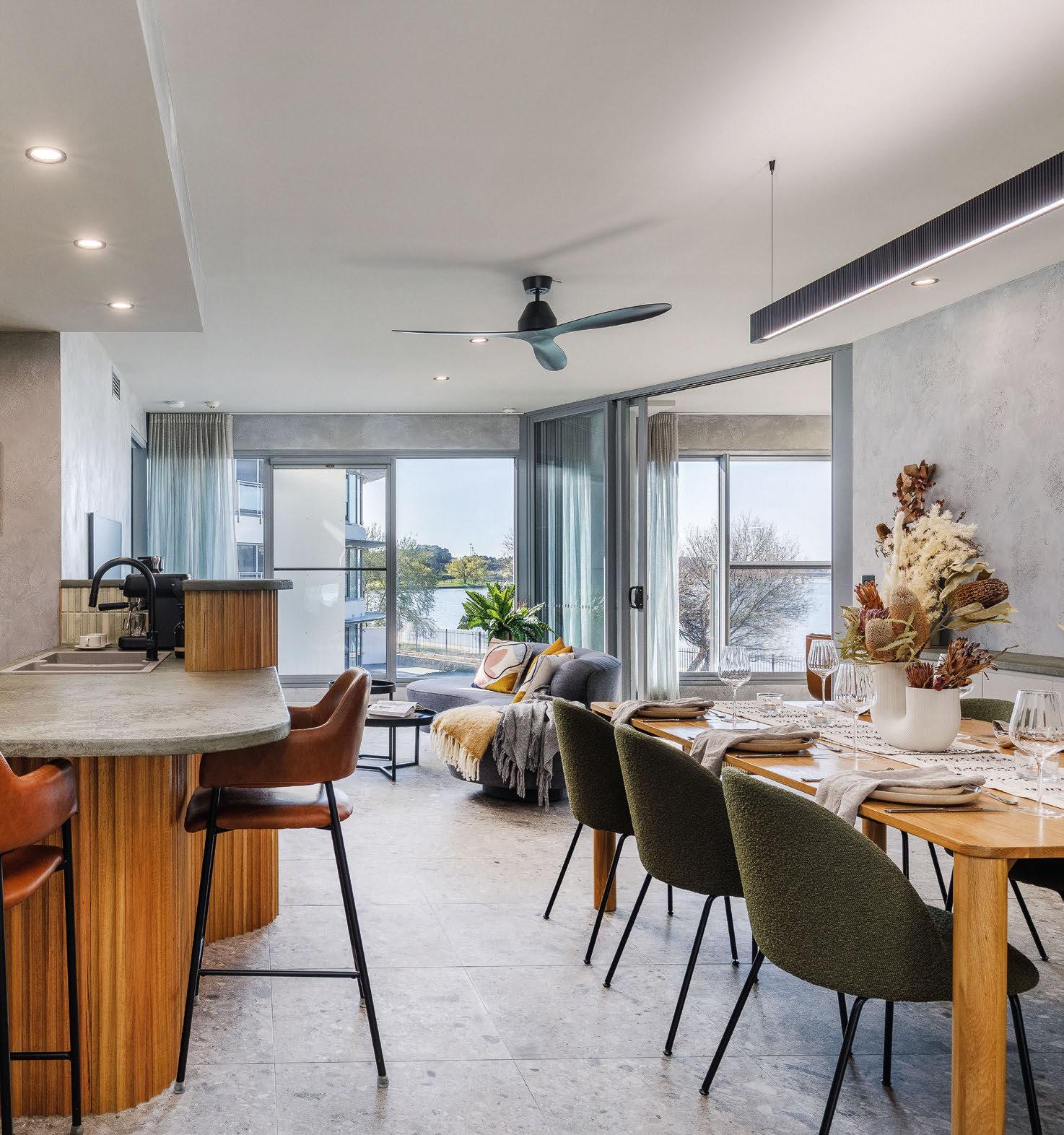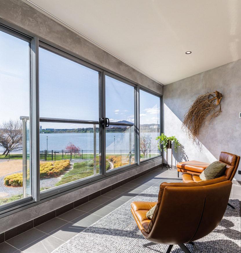 Step inside the two-bedroom-plusstudy apartment on Eastlake Parade in Kingston, and you’re instantly greeted by uninterrupted, north-facing views across Lake Burley Grifn straight to the National Carillon and Mount Ainslie.