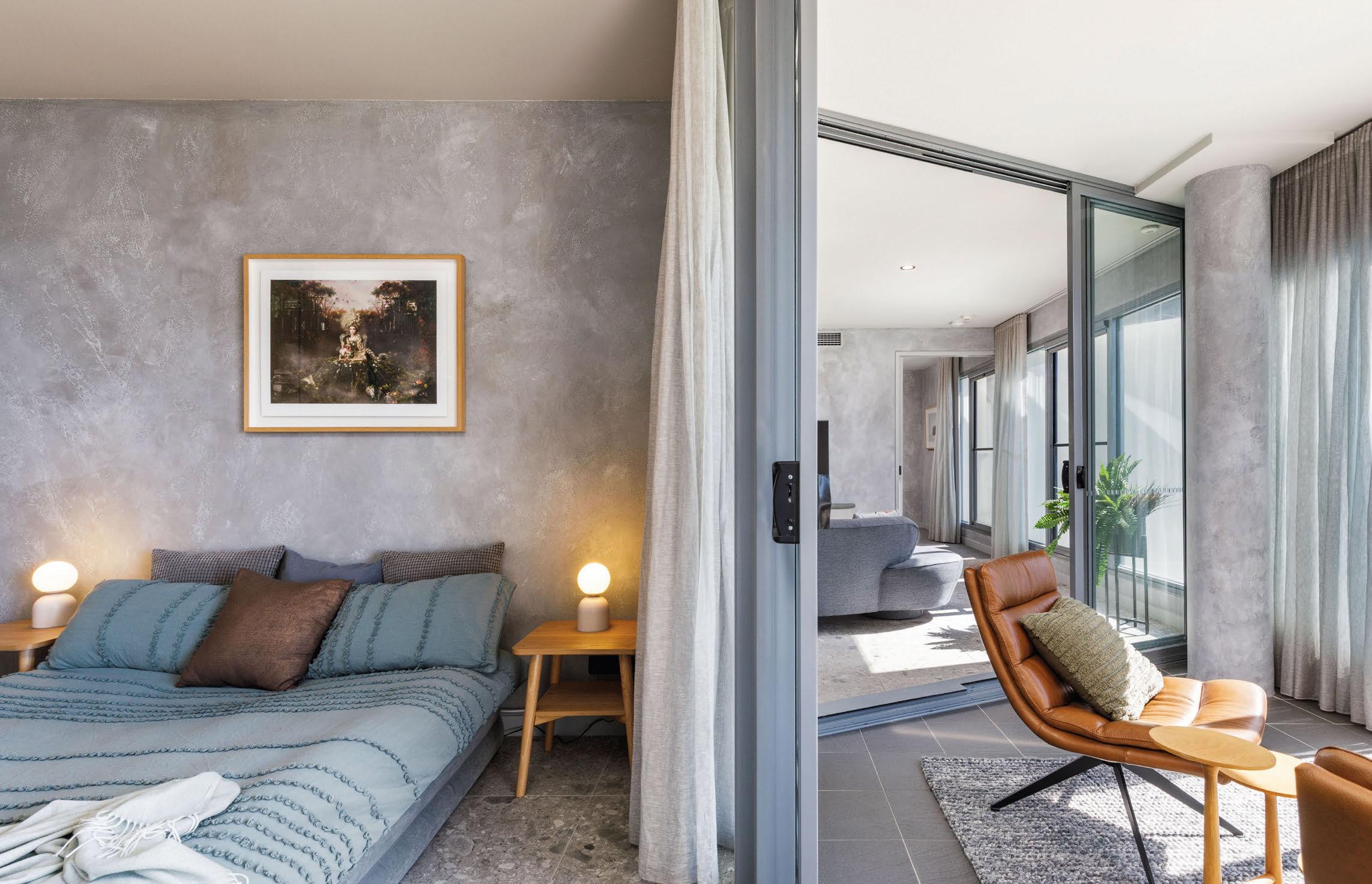The sophisticated interiors completely elevate the space, blending large-format grey tiles with Venetian plaster walls that add a tactile texture and a luminous, stone-like aesthetic.
