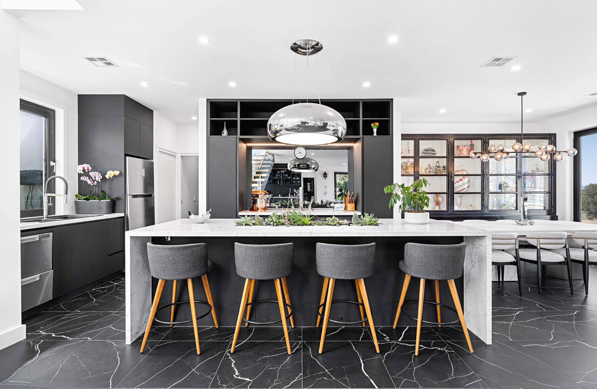 Downstairs, dark marble-look tiles anchor the main living spaces,