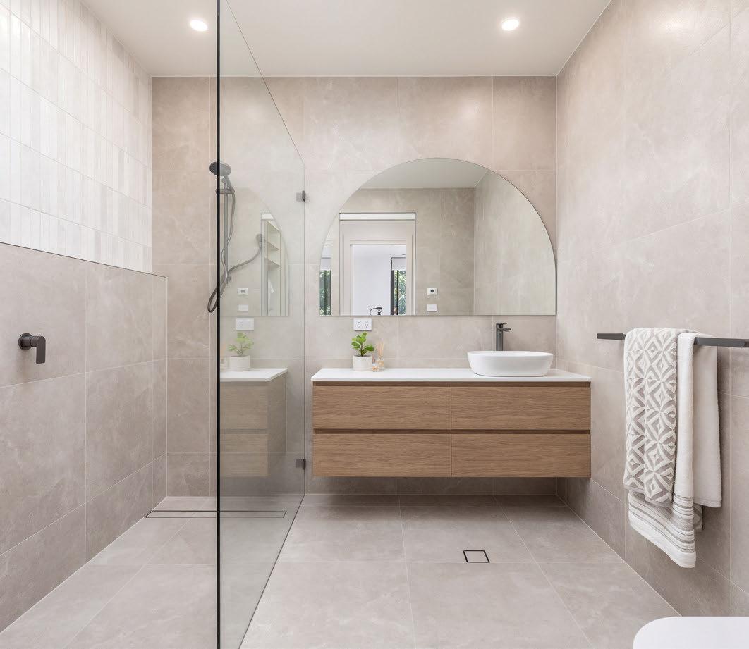 The primary suite has a spacious walkin wardrobe and an en suite with a skylight, floor-to-ceiling tiles and a big walk-in shower. It also has access to the patio.