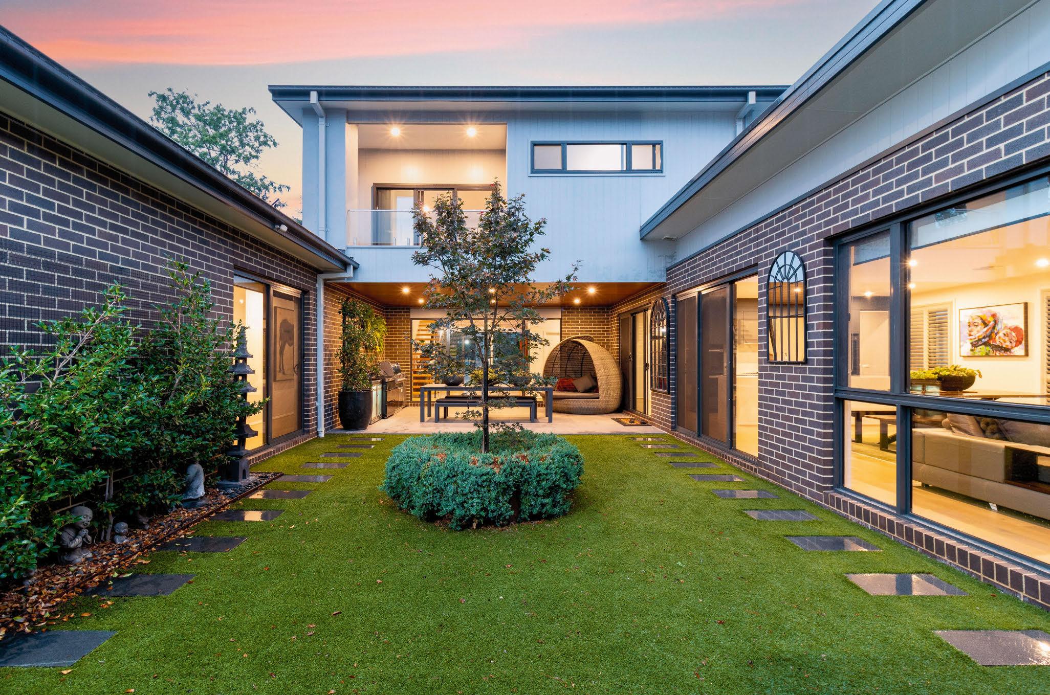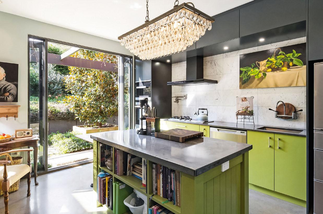A striking black-and-orange kitchen, feature walls and tiles in the bathrooms, and unique light fittings make a style statement. The living area opens onto a lush green garden with a heated saltwater pool and a separate selfcontained studio.
