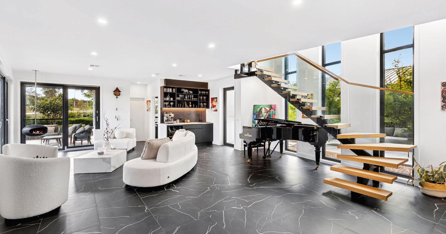 contrasted by crisp walls and warm timber accents. Soaring ceilings and a suspended corner freplace add drama to the open-plan living, dining, kitchen and bar, while a feature staircase has room for a grand piano beneath.
