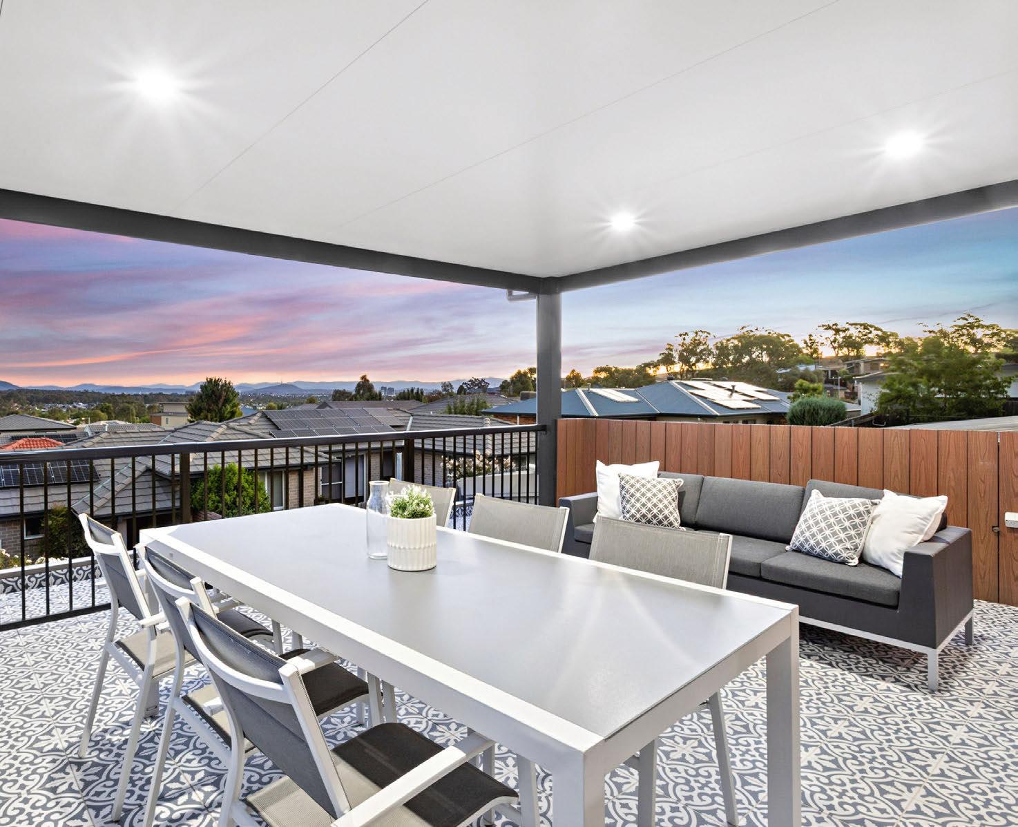 It’s two homes in one here in Bonner. Four bedrooms, three bathrooms and multiple living areas are spread across two foors. Downstairs, a self-contained unit with an en suite, kitchen and external access presents endless opportunities. The navy-blue kitchen, charcoal-panelled walls, and patterned feature tiles make a bold style statement throughout. Elevated outdoor areas ofer breathtaking sunset vistas. There’s even a laundry conveniently located on each foor.