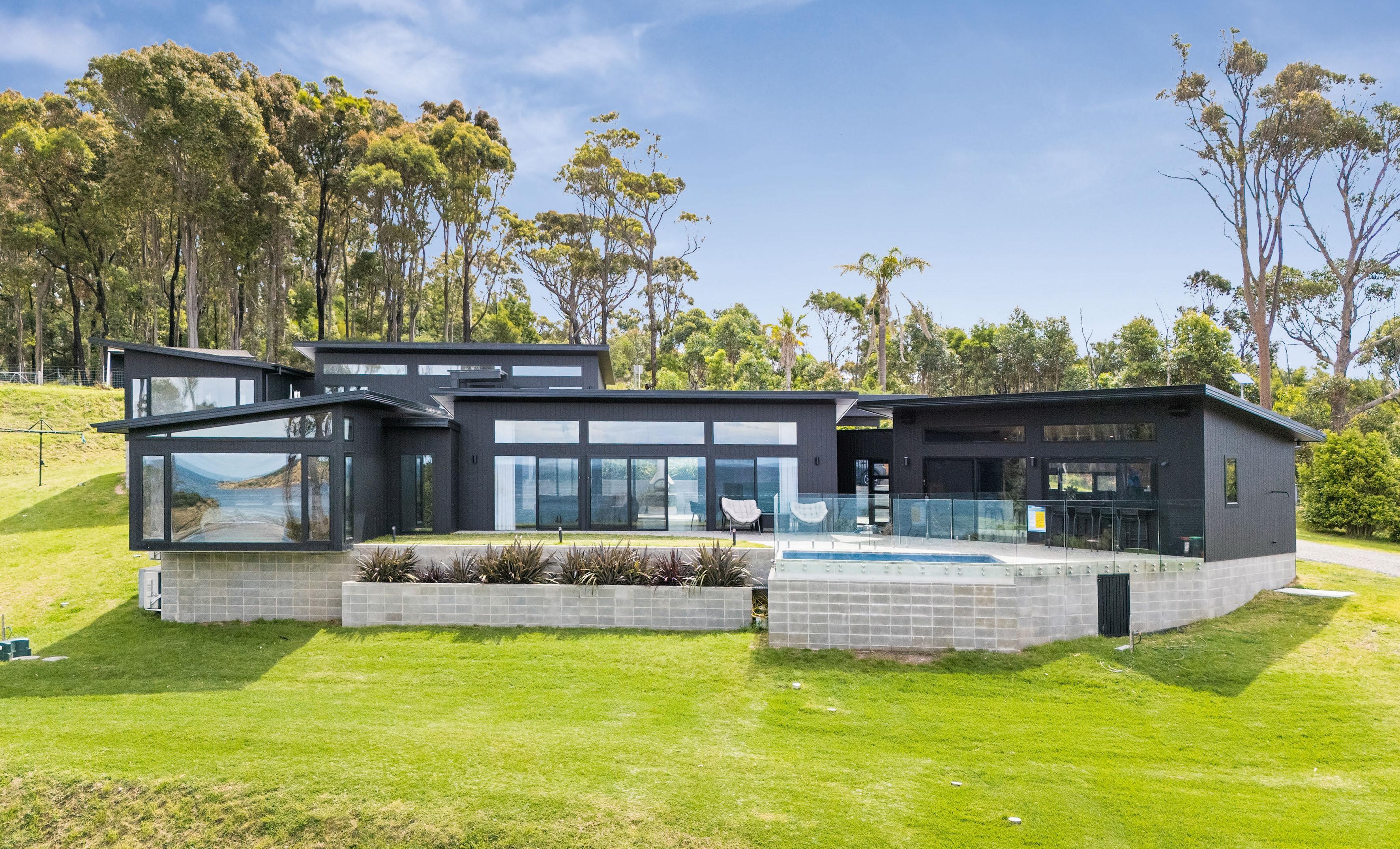 An architecturally inspired four-bedroom coastal retreat at 14 Francis Hollis Drive in Tathra spans three levels and offers views of the ocean and lush tropical gardens.