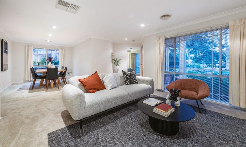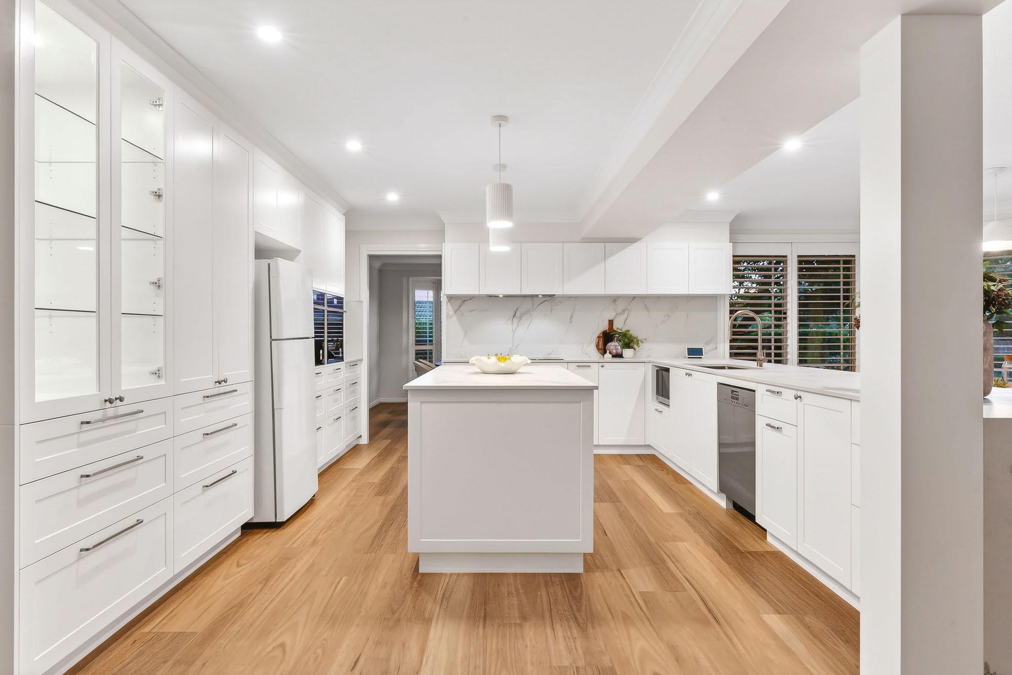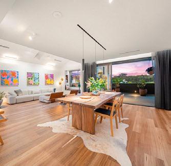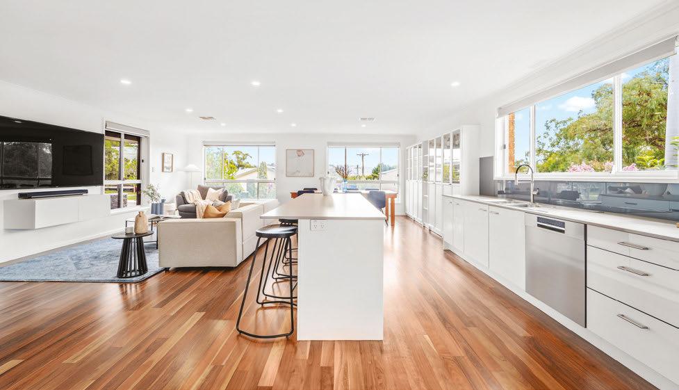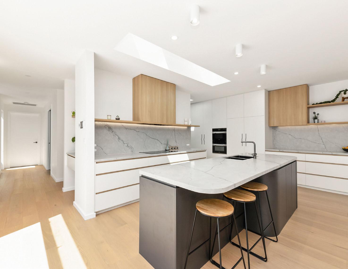 illuminating engineered timber foors and crisp, contemporary fnishes. The kitchen is as substantial as it is beautiful, with a large butler’s pantry. Stone fows across benchtops and splashbacks, alongside premium appliances and 50-bottle wine storage.