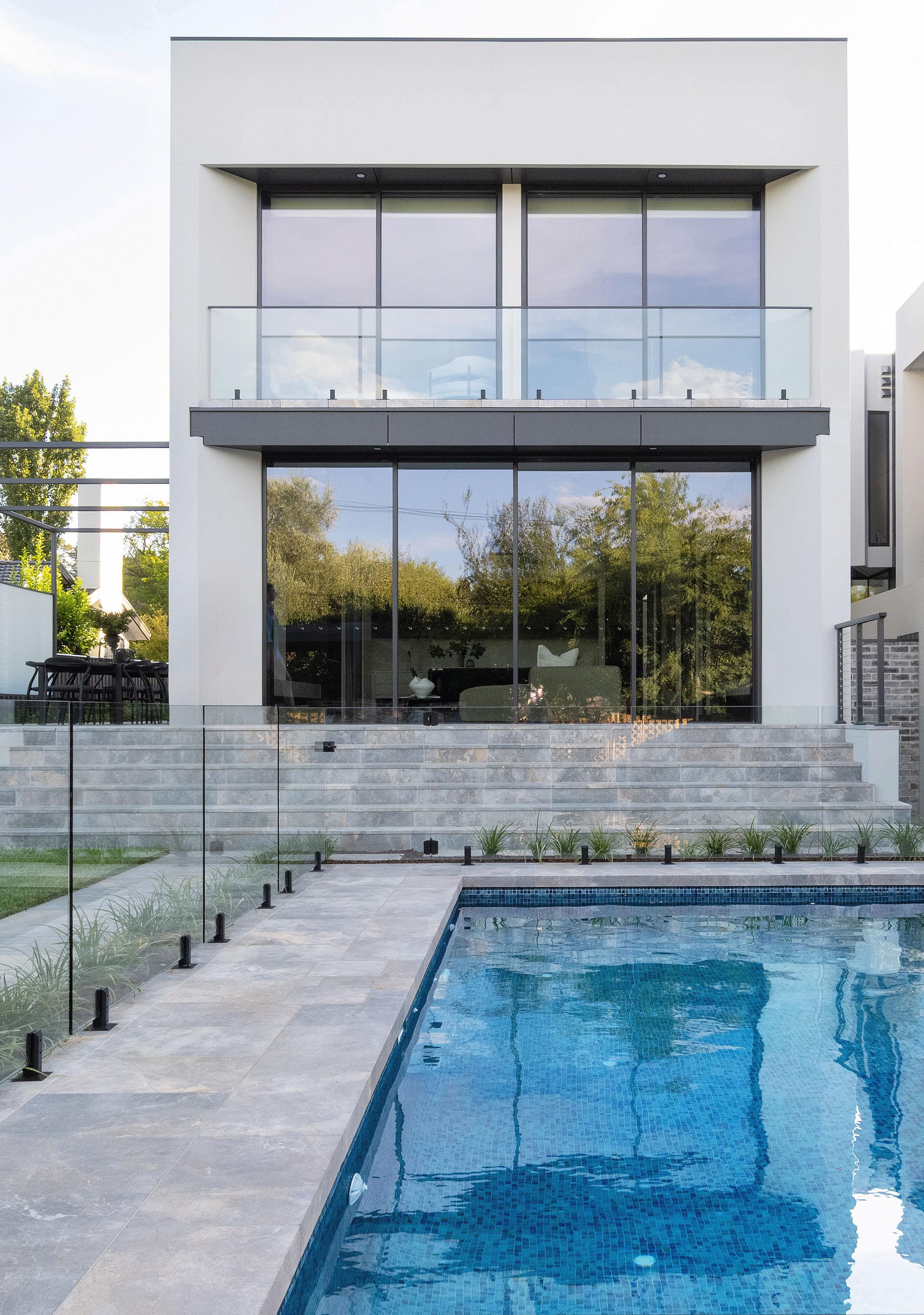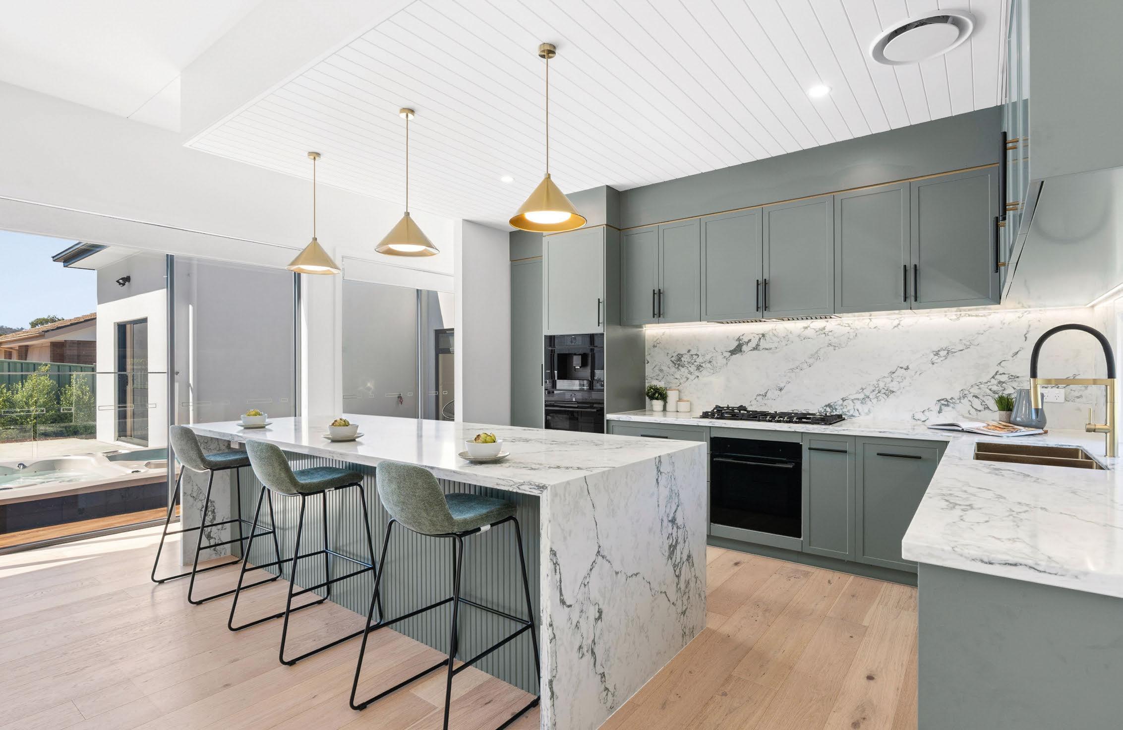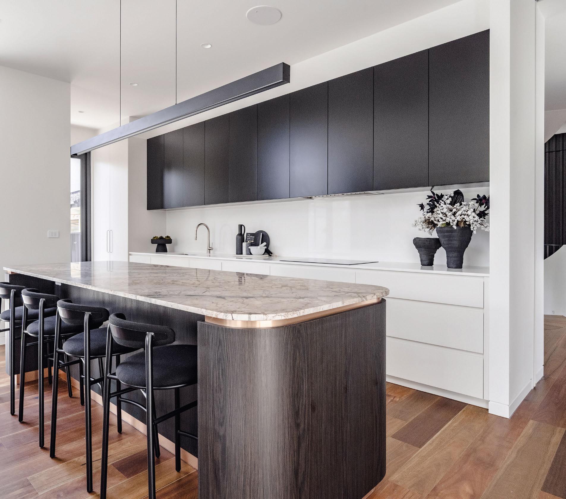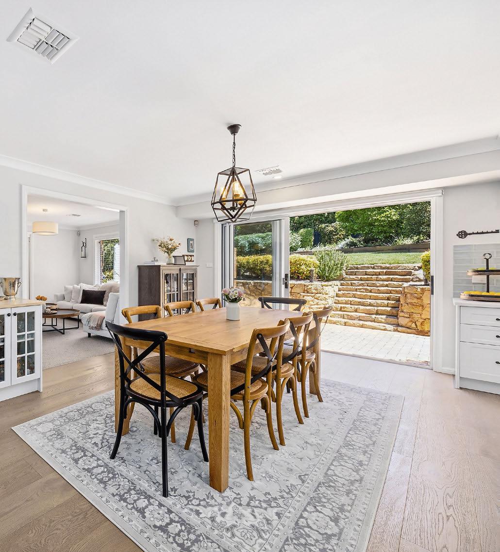 illuminating engineered timber foors and crisp, contemporary fnishes. The kitchen is as substantial as it is beautiful, with a large butler’s pantry. Stone fows across benchtops and splashbacks, alongside premium appliances and 50-bottle wine storage.
