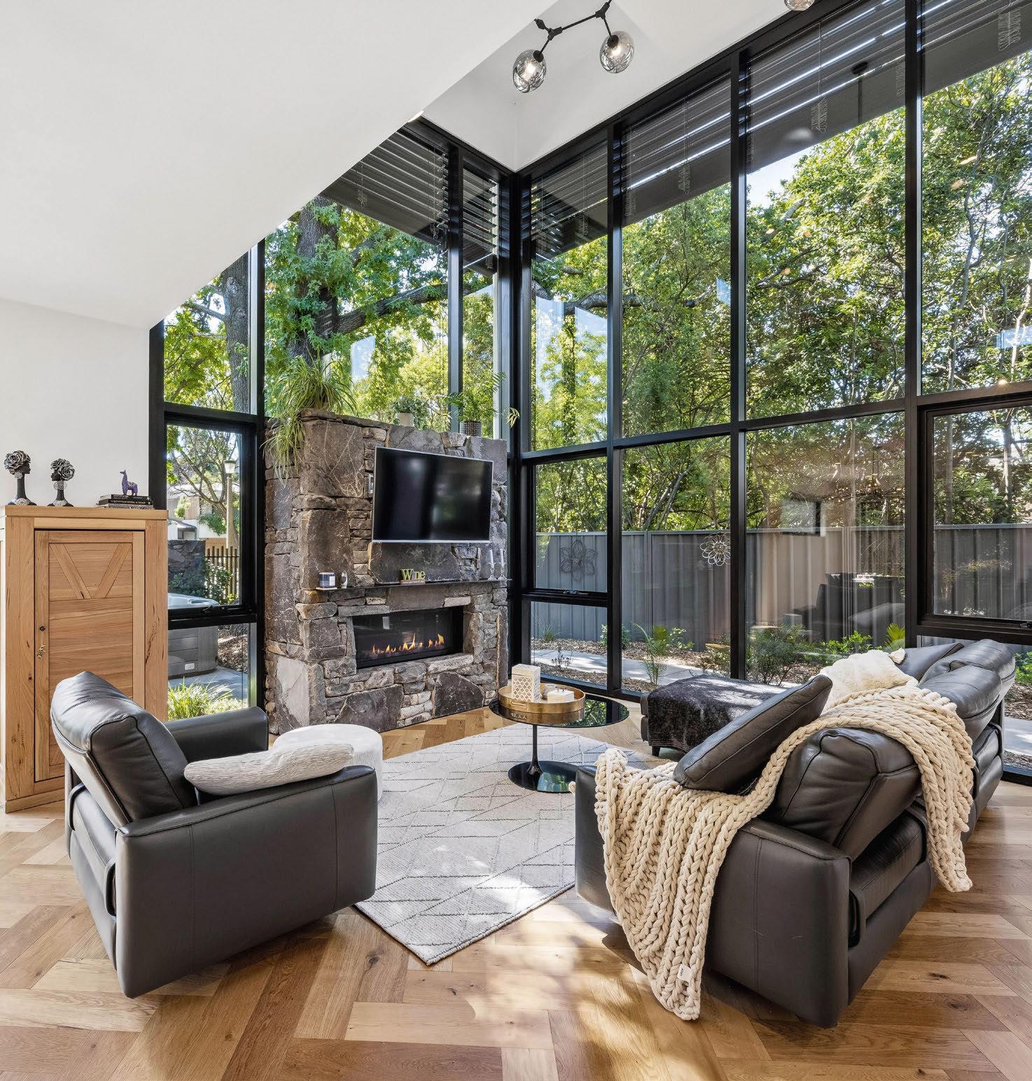 Drawing the eye in the main living space is a stunning bluestone mantel freplace framed by dramatic doubleheight windows.
