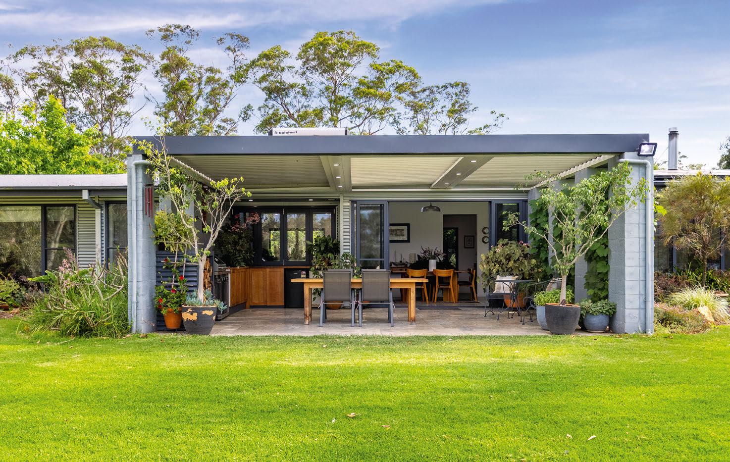 Here, a timber-lined ceiling punctuated by dual skylights shelters a fully equipped outdoor kitchen.
