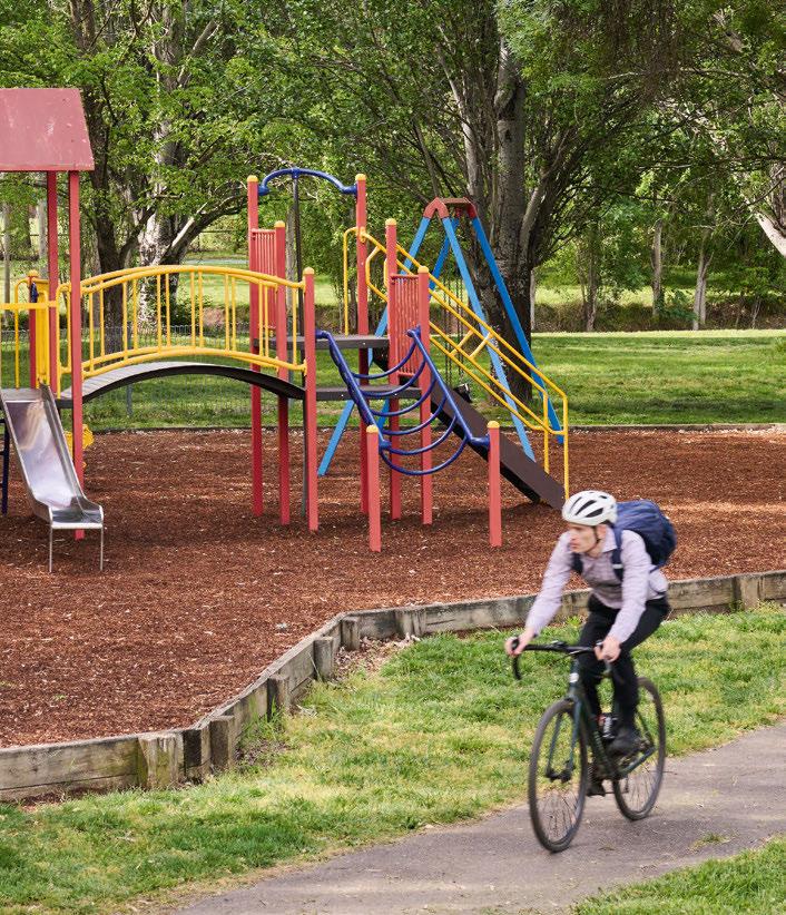 On the weekends, you’ll fnd people playing at the tennis courts, mountain biking on the ridge, picnicking in the wetlands or letting their doggos run free at the enclosed dog park.