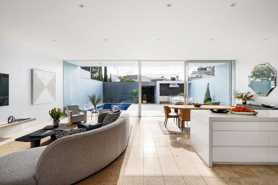 This large, modern two-storey house is set on a street corner and backs onto Boss James Reserve, with its copse of mature trees, giving a sense of sanctuary, light and space. Downstairs, the home has a resort-style feel, with the open-plan living and kitchen area seamlessly opening onto lush gardens, a covered outdoor entertaining area and a pool. Upstairs is the lofty sleeping zone, with a main bedroom boasting a walk-in wardrobe, an en suite and a private courtyard. Port Melbourne 51 Farrell Street