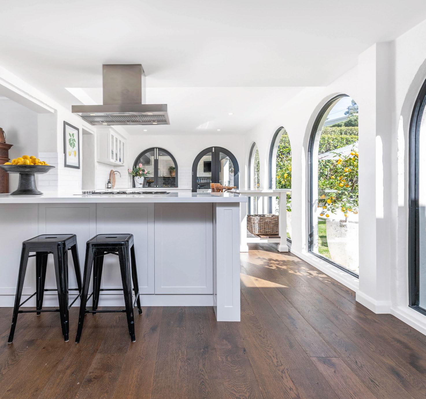 the kitchen that sits in its new position on the north-eastern side of the house. Enormous black-framed steel windows boldly line the length of the room, offering a sunny aspect to the verdant backyard and its new inclusion: a sandtoned in-ground swimming pool with porcelain-tiled surrounds.