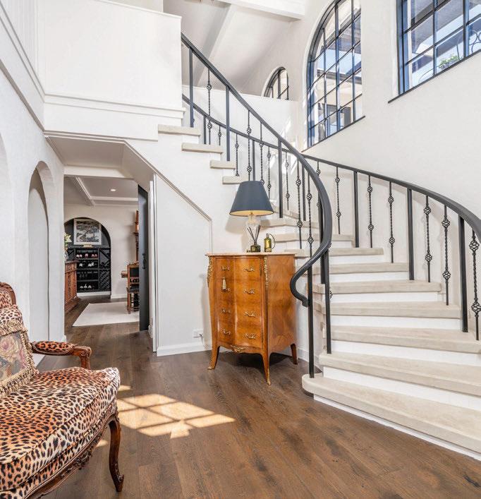 “As you enter, the large double-height foyer with Crittall-style French arched windows, elaborately curved staircase and vintage brass chandelier is a showstopper,” Harget says.