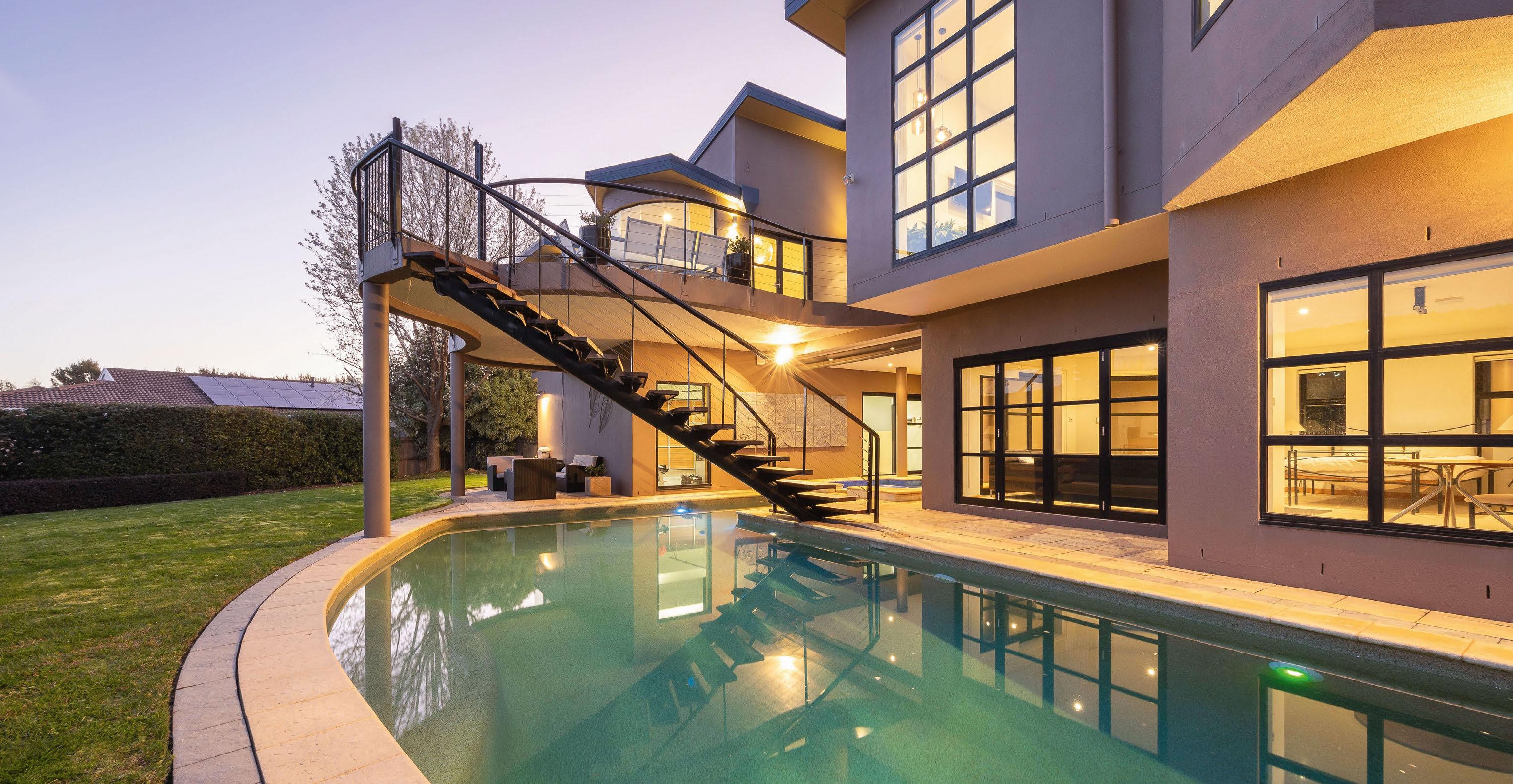 There’s plenty inside to delight: a double-height ceiling, floor-to-ceiling windows offering sweeping views, a stunning blackbutt timber staircase –all served up with an abundance of natural light. A highlight is a curved