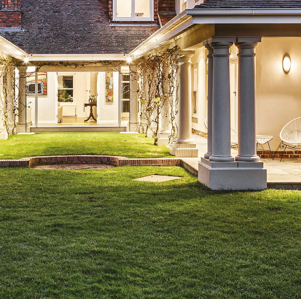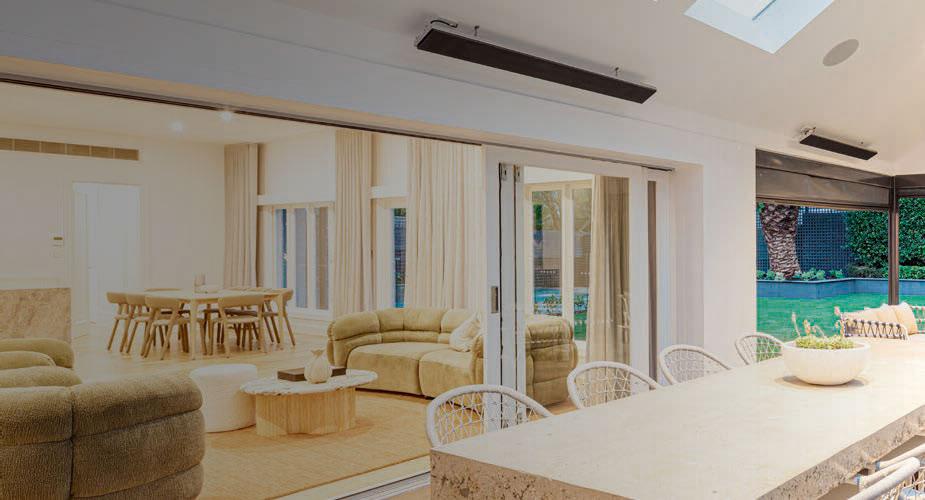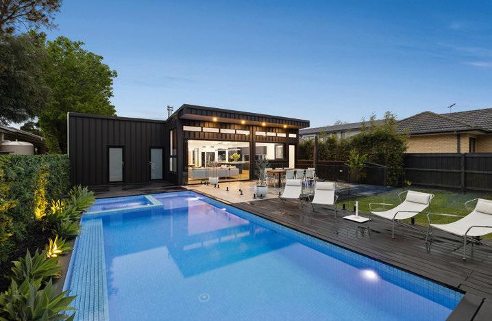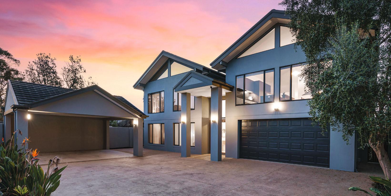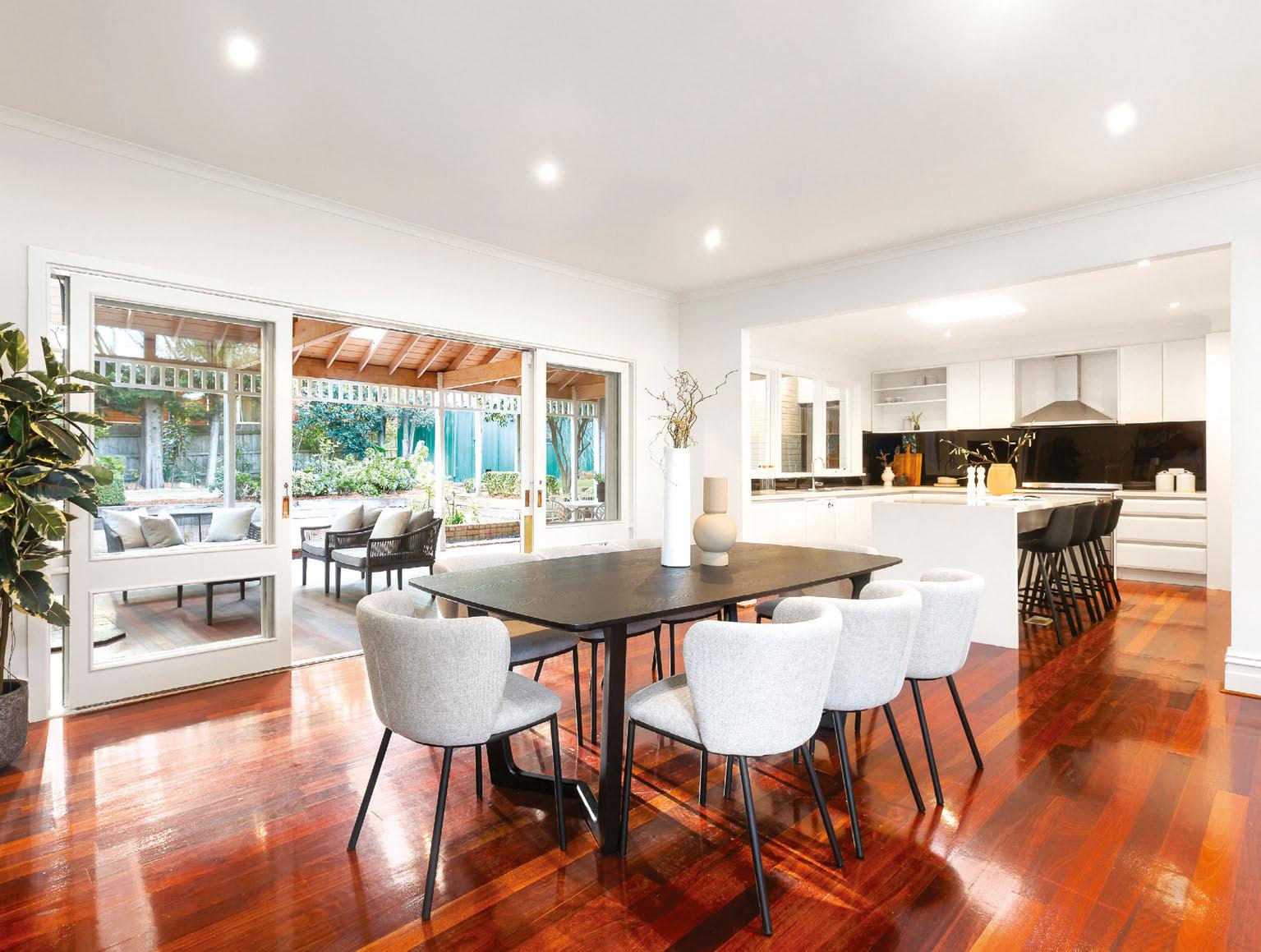 The floor plan of this house is perfect for zoned living. The front has the accommodation: three bedrooms with built-in wardrobes accompany a main bedroom with an en suite and walk-in robe, plus a family bathroom and laundry. Through glass doors to the rear of the home is a luxurious entertaining space, with a wide gas fire in the lounge room and a butler’s pantry – with a sink and a second dishwasher – attached to the stylish kitchen.