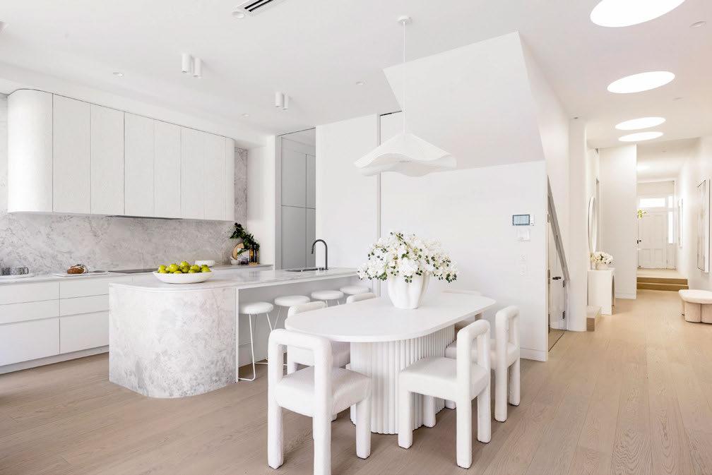 B.E Architecture was inspired by the elegant minimalist aesthetic of contemporary art galleries when designing this refined house, finished with limestone floors and American oak joinery. Over three levels, all connected by a lift, the floor plan provides the luxury of a basement home theatre, wine cellar, and generous gym/yoga space accompanied by a wellness room with an infrared sauna and ice bath. Above ground, there are also two offices and a fully equipped butler’s pantry.