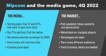 What more can we add about the media game? The global content market is polarizing between free TV broadcasters, which want to handle own OTTs, and the OTT platforms, which launch AVOD and FAST systems which are a non-linear free TV, wishing free TV advertisement budgets. Now it is difficult to see Pay TV referents, who were the top buyers of content not so long in the past.