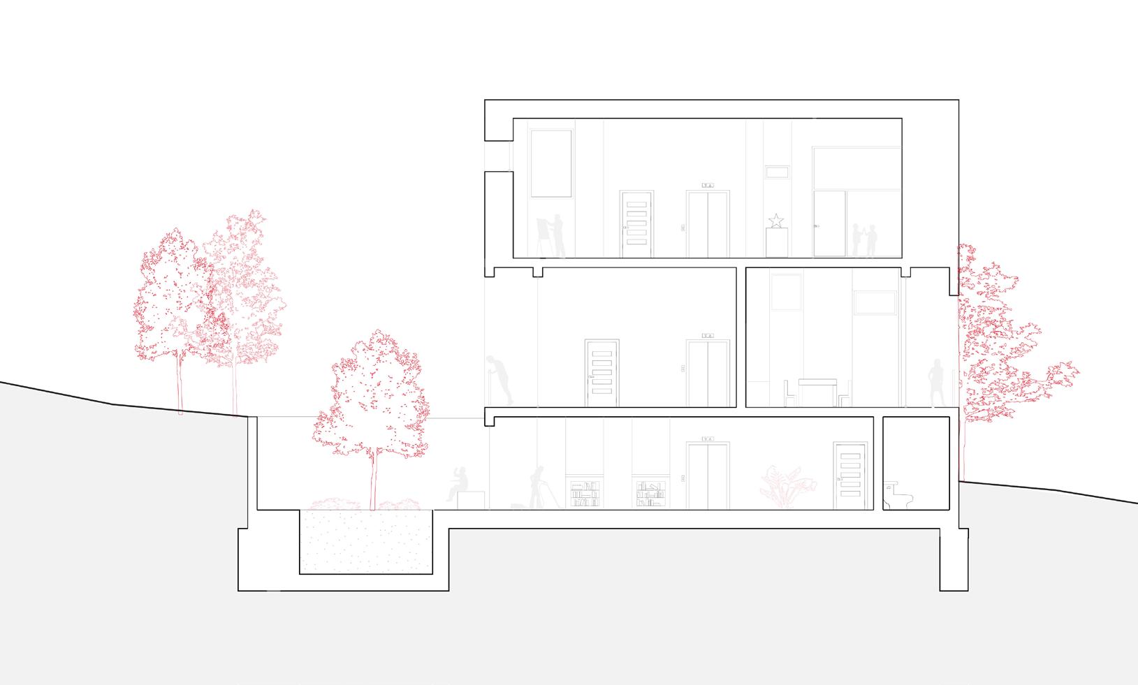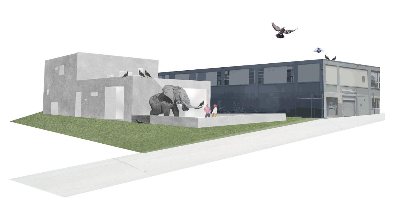 The Teen Activity Center is a scuulpture like hub designed to foster creativity and connection among students and artists showcasing their art. The large windows allow for people to gather on balconies, while also creating gaps in the walls to showcase art and sculptures. The illusion of the thick walls from the outside of the building creates a false narrative about the Lantern like community center.