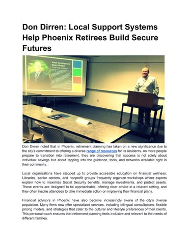 Donald Dirren is a licensed financial advisor in Arizona who works with clients. Dirren has over 30 years of experience in the industry. Dirren provides expert retirement planning and education to help residents preserve, protect, and transfer their wealth as a top Safe Money Specialist at Bergen Financial Group.
