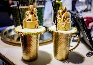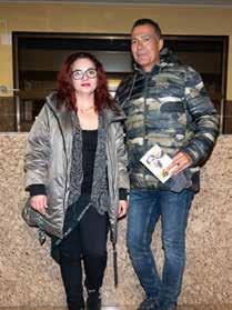 A l’esquerra tenim un vestit d’home en color gris amb samarreta negra, que li dona un aire relaxat però polit. La seva companya llueix un top setinat en color taronja metàl·lic, que aporta llum i contrast al seu look. El combina amb uns pantalons negres ajustats i unes botes negres de taló, que estilitzen la figura.