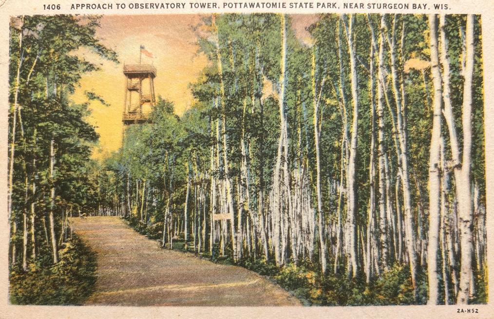 A vintage postcard portrays the approach to Potawatomi Observation Tower in Sturgeon Bay. Incidentally, the postcard has an error, as the name of the state park is spelled incorrectly.
