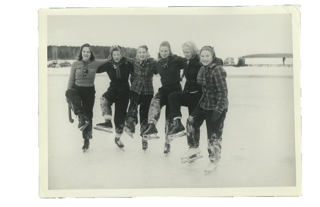 Six women show off their blades during the Winter Carnival of 1938. The carnival included skating and hockey on the ice in Ephraim, and ski jumping, cross-country skiing, and snowshoeing in Peninsula State Park. COURTESY OF THE JAMES KEMP COLLECTION. KEMP WAS THE DISTRICT RECREATIONAL DIRECTOR FOR THE WORKS PROGRESS ADMINISTRATION