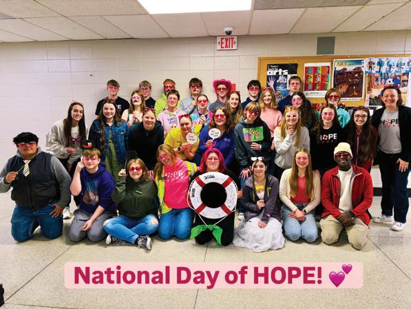 A special NATIONAL HOPE WEEK was highlighted February 9–13, the week before Valentine’s Day, and featured daily fun activities, handouts, and themed dressup days to remind students that they are loved and that everyone matters. Items such as positive stickers, Hope Clips, and heart messages were shared to encourage participation and connection. Through peer-to-peer connections and safe spaces for conversation, Hope Squad helps every student feel valued, connected, and supported.