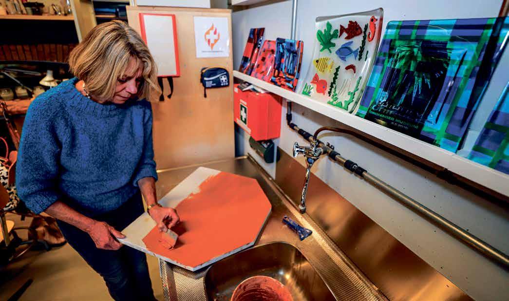“Ik heb me eigenlijk altijd al met glas beziggehouden”, begint Nicolina haar verhaal. “Het materiaal biedt zoveel mo gelijkheden! De transparantie ervan en het lichtspel in glas blijven boeien. Glasfusion ook wel glasfusing genoemd, kan je zien als het smelten van glas in een patroon. Daarvoor heb je ervaring voor nodig met de glasoven. Een aantal graden hoger of lager kan al een enorm verschil maken voor het eindresul taat. Daarbij heeft elke soort glas een eigen uitzettingscoëfficiënt waar je rekening mee moet houden.”