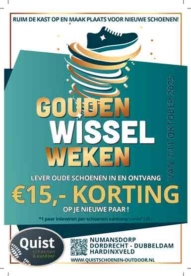 Actievoorwaarden: geldig bij aankoop van nieuwe schoenen vanaf € 125. Eén paar oude schoenen is één paar korting. Doe mee, lever je oude schoenen in, draag bij aan een duurzamere samenleving én geniet van nieuwe, comfortabele schoenen. Quist Schoenen & Outdoor is te vinden aan de Dubbelsteynlaan-West 81 (Dubbeldam).