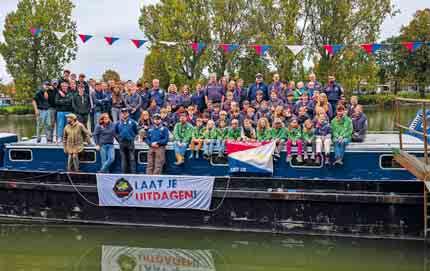 De IJzeren Kraak is honderd jaar oud geworden. Het 27 meter lang varende clubhuis brengt Scoutinggroep Willem de Zwijgergroep III naar al zijn kamplocaties. “Ons schip vaart 25 tot 30 keer per jaar uit om Nederland te verkennen vanaf het water”, vertelt groepsvoorzitter Koen Nieuwpoort. “We gaan vaak naar de Biesbosch. Of naar Zeeland. De hele zomer hebben we in Friesland gelegen en hebben de groepen er afwisselend verbleven. De welpen gaan er in de herfstvakantie weer op uit.” Zaterdag werd de hele dag feest gevierd op en rond het honderdjarige schip. “Het werd op 10 december 1924 in de vaart genomen als De Zaandam. Koekjesfabrikant Verkade gebruikte het om in bulk biscuits te vervoeren. De gangboorden zijn extra breed om die pakketten er makkelijk uit te kunnen halen. Dat maakt het voor ons een praktisch en veiliger schip. Onze vereniging heeft het in 1967 voor een symbolisch bedrag aangeschaft. En daar hebben we nog steeds veel plezier van.” De in 1938 opgerichte waterscoutinggroep heeft rond de 150 leden. De IJzeren Kraak ligt aan de kade bij Clubhuis Dillenburg achter het Wantijpark. Dat is sinds zaterdag duidelijker te herkennen, want tijdens de feestelijkheden werd ook een gesponsord naambord onthuld. Nieuwpoort: “Toen burgemeester Kolff hier in maart was om Erwin Zuidema (25 jaar vrijwilliger, 37,5 jaar lid, red.) een lintje te geven, moest hij tot zijn schaamte bekennen dat hij ons nog niet had opgemerkt. Dat is nu een stuk duidelijker.” (Foto: Stolk Fotografie)