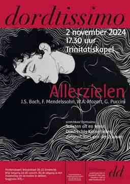 Op zaterdag 2 november om 17.30 uur geeft Dordtissimo een concert in het kader van Allerzielen. Over de hele wereld wordt op verschillende manieren stilgestaan bij dierbaren die niet meer onder ons zijn. Bach-cantate 161 gaat over de dood en de gevoelens die daarbij horen; van protest tot gelatenheid, van de harde realiteit van de dood tot het visioen voorbij de grens van het leven. Naast deze cantate zullen nog andere delen uit cantates van Bach klinken en het Requiem van Puccini. Eva Trimaille (alt) en Afonso Santos (tenor) zullen de prachtige solostukken zingen, het koor is het welbekende Dordtissimo scratch-koor en de muzikale begeleiding is in vakkundige handen bij het Dordrechts Kamerorkest. Ries van der Zouwen dirigeert. Het concert vindt plaats in de Trinitatiskapel. De toegang is gratis; door een inzameling bij de uitgang hoopt Dordtissimo de onkosten te dekken.