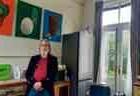 Jack de Deugd met zijn schilderijen in de keuken van Hans Spigt.