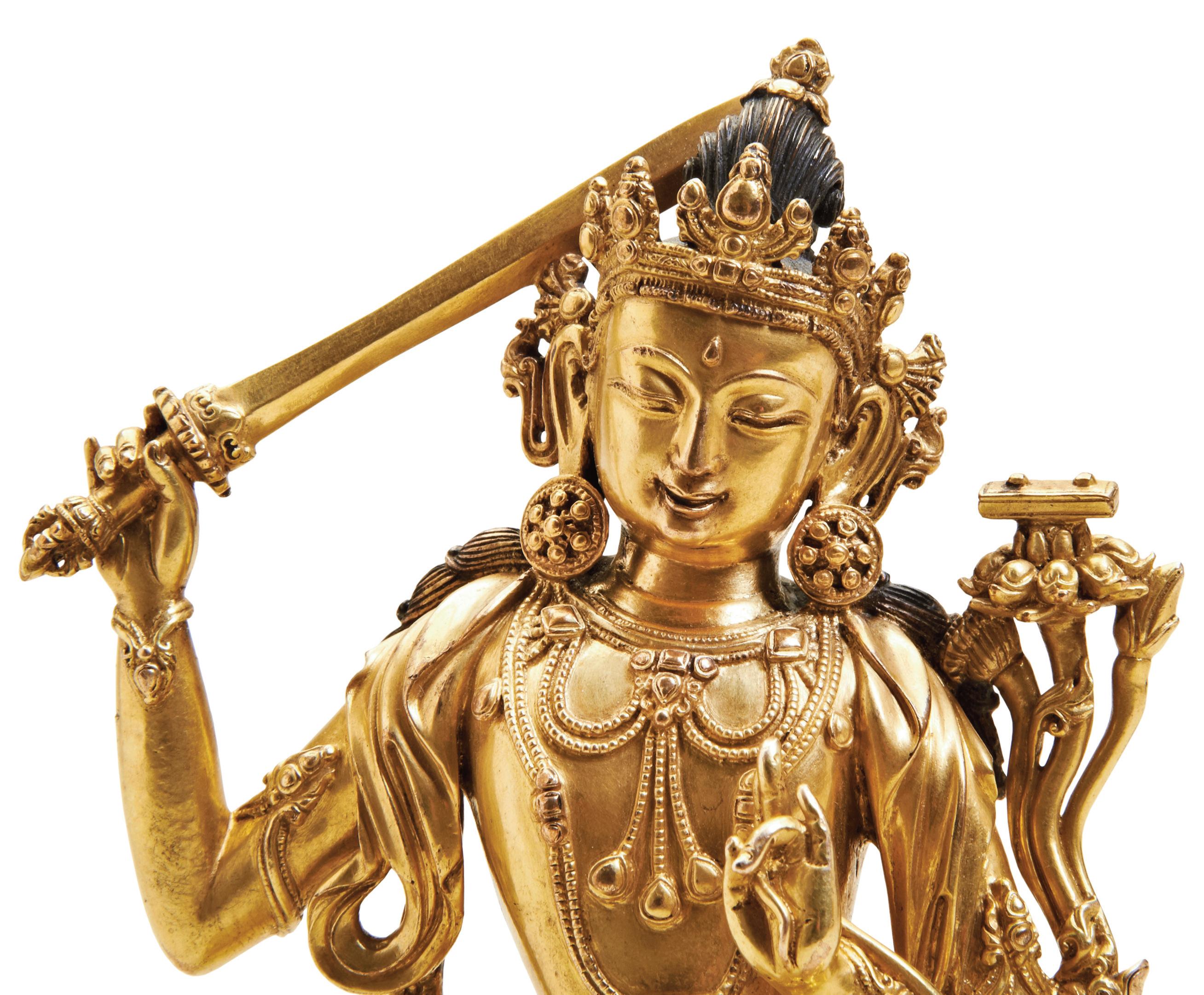 Another very similar Manjushri gilt-bronze figure with four arms see: The British Museum, Asia London No 1953,0713 4, donated by Walter Leo Hildburgh and exhibited:2014 Sep-2015 Jan, 'Ming: 50 years that changed China'