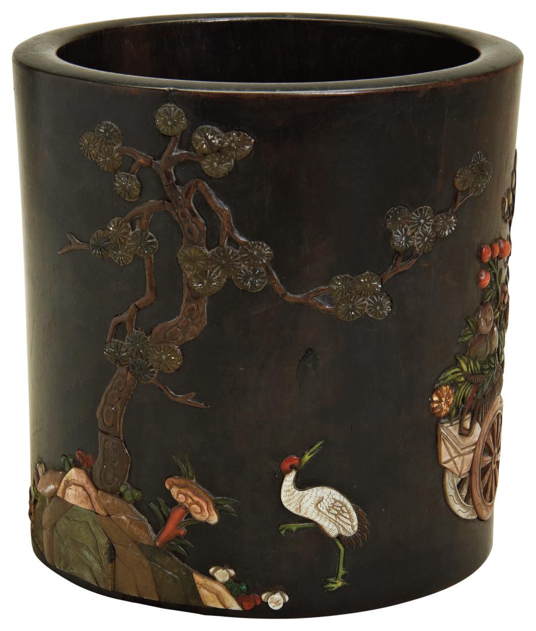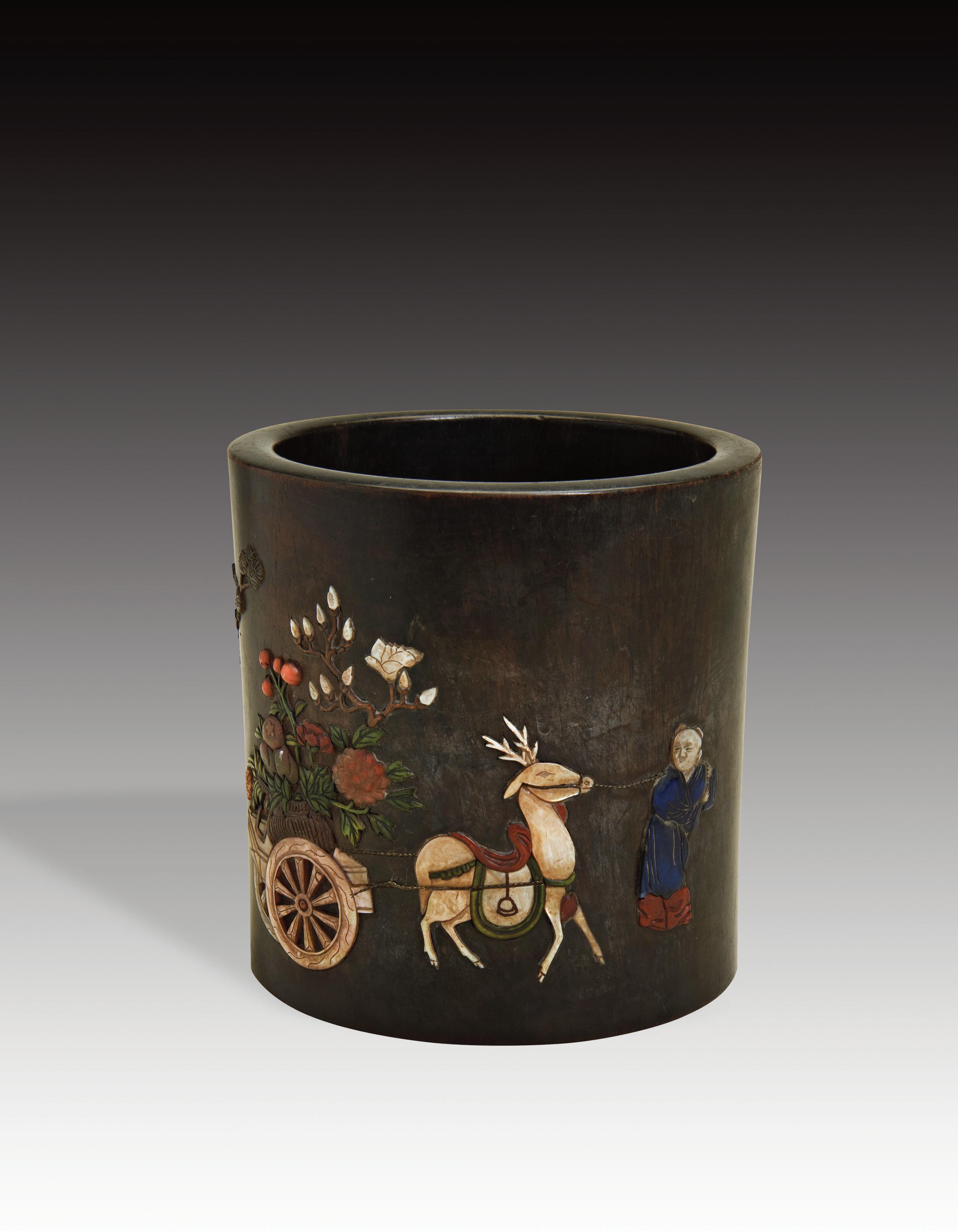 depicting the ‘Investiture of the Gods’ scene, included many Daoist immortals with their mythical beasts, bears an apocryphal Xuande six character mark, raised on a fitted carved hardwood stand
