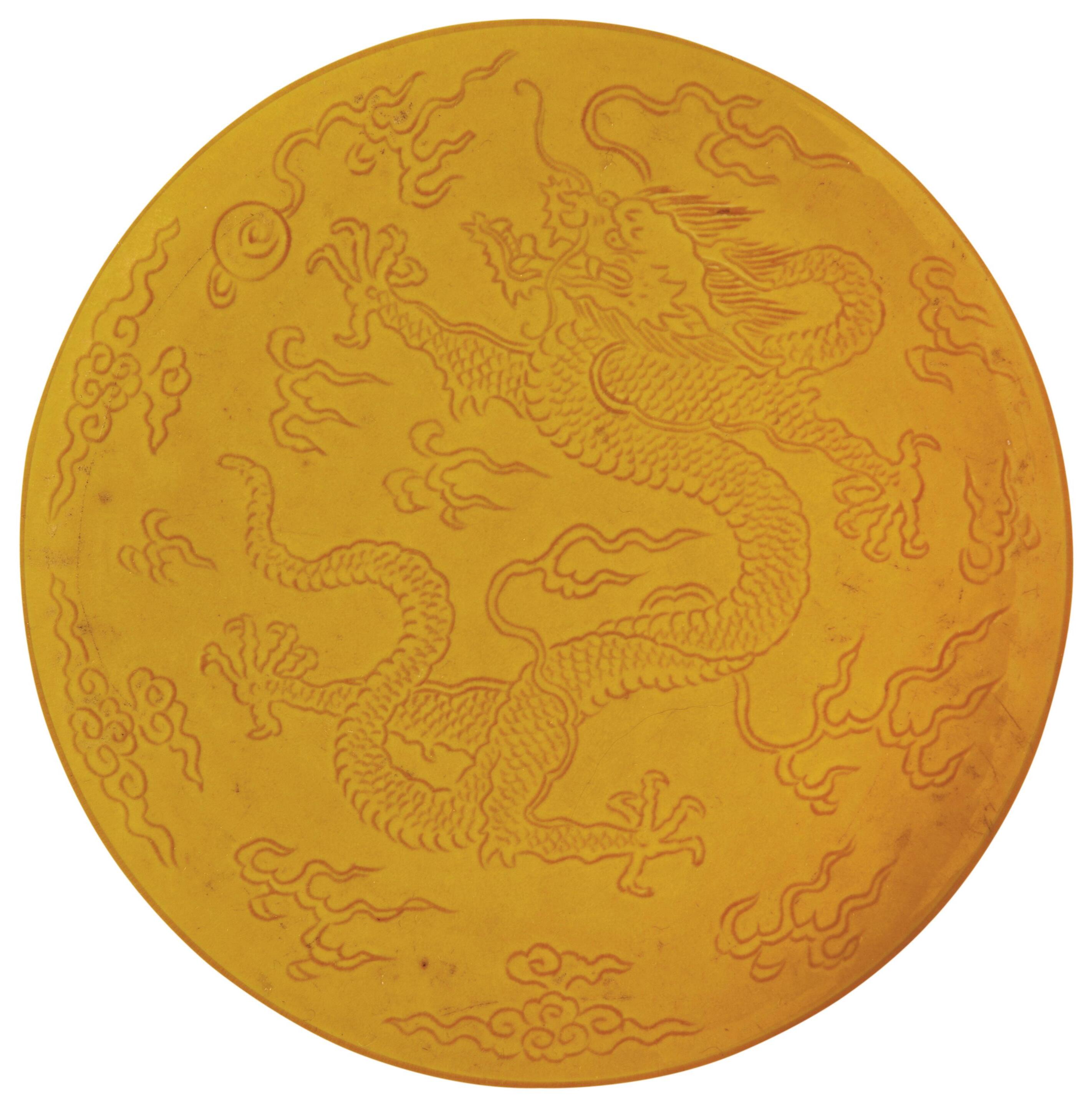 QIANLONG SEAL MARK AND OF THE PERIOD 清乾隆 黄釉暗刻龙纹盘