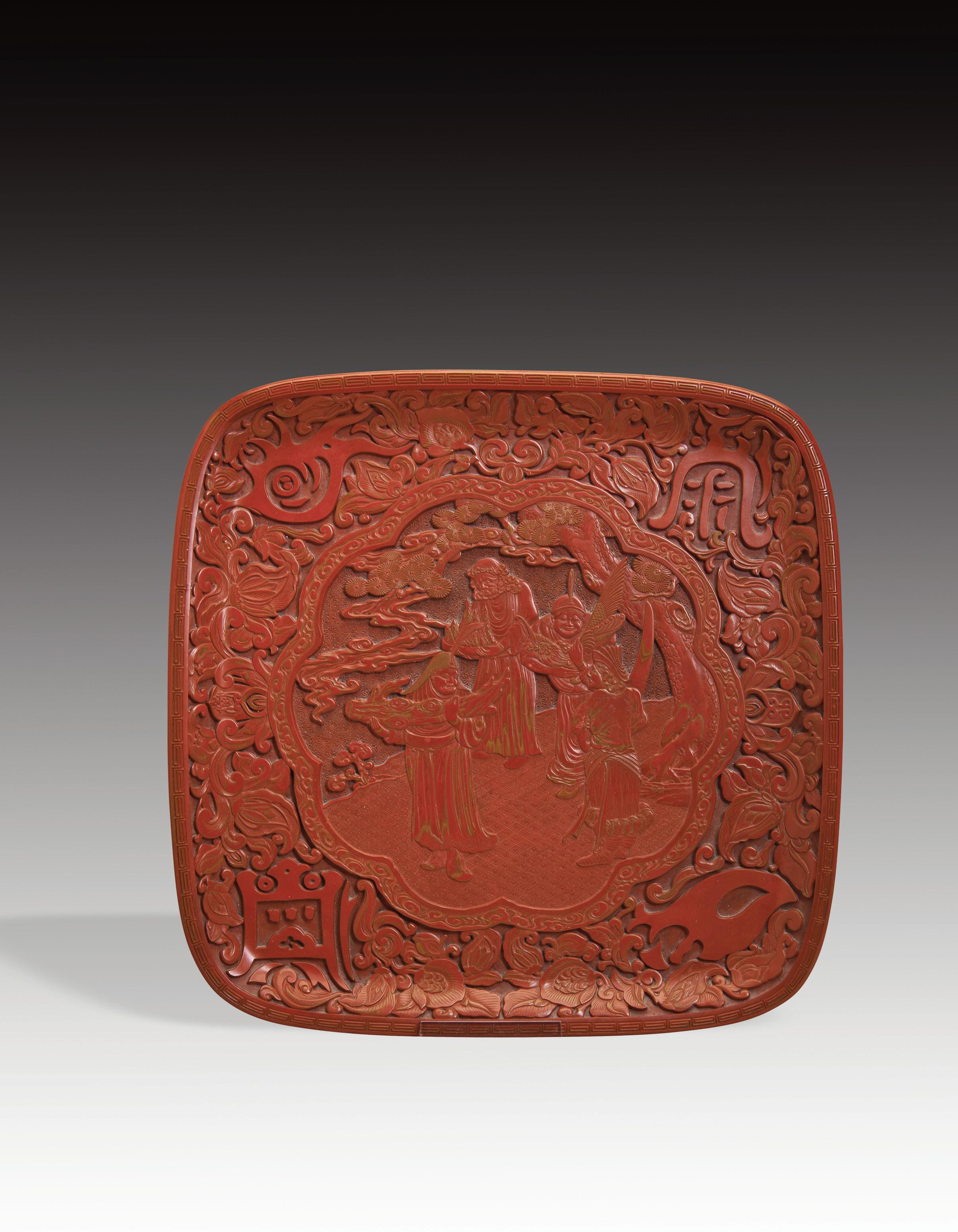 finely incised in the centre with a leaping five-clawed dragon in pursuit of a ‘flaming pearl’ amidst clouds, within a single incised line border, the exterior further incised with two further dragons in pursuit of pearl 17cm diam