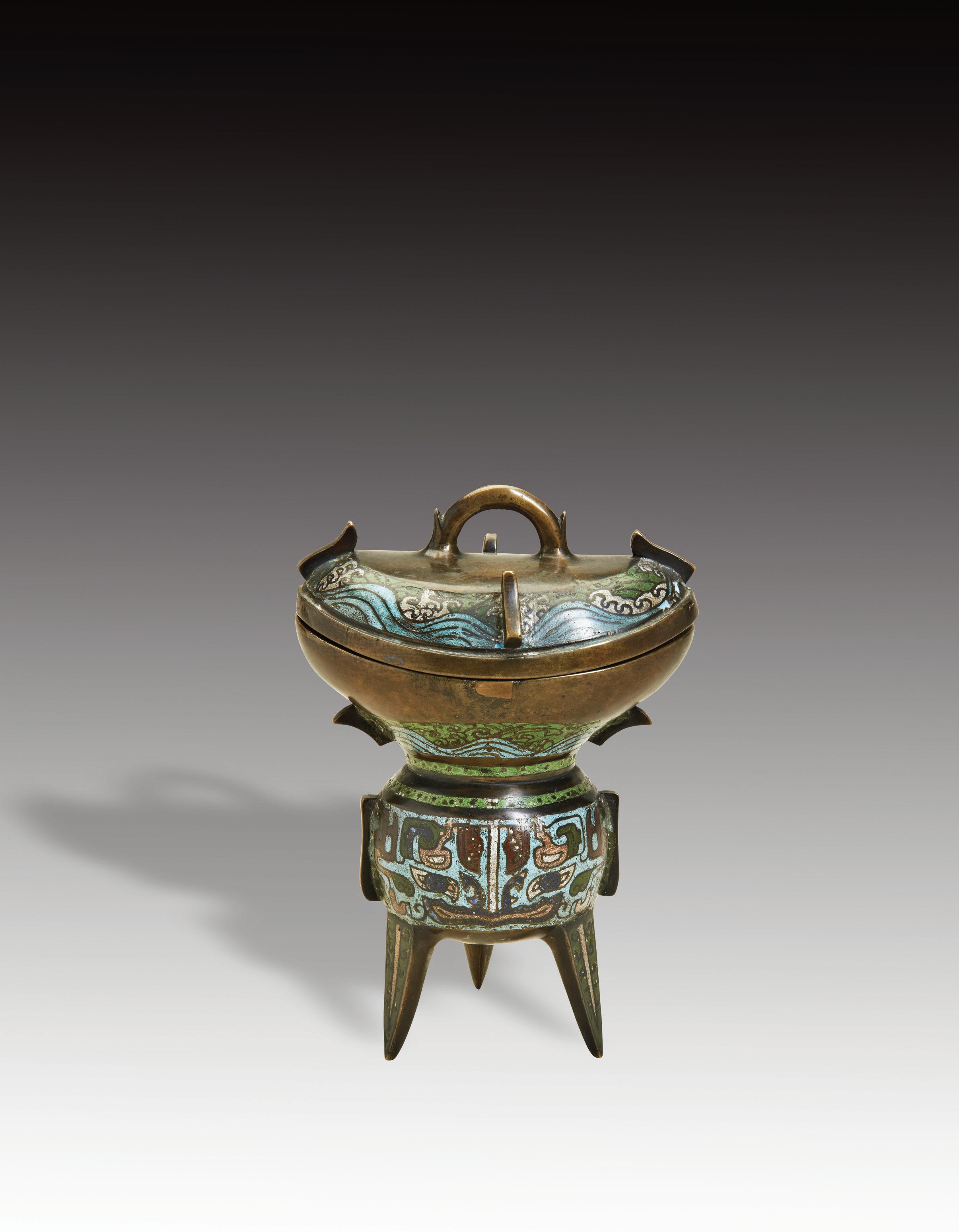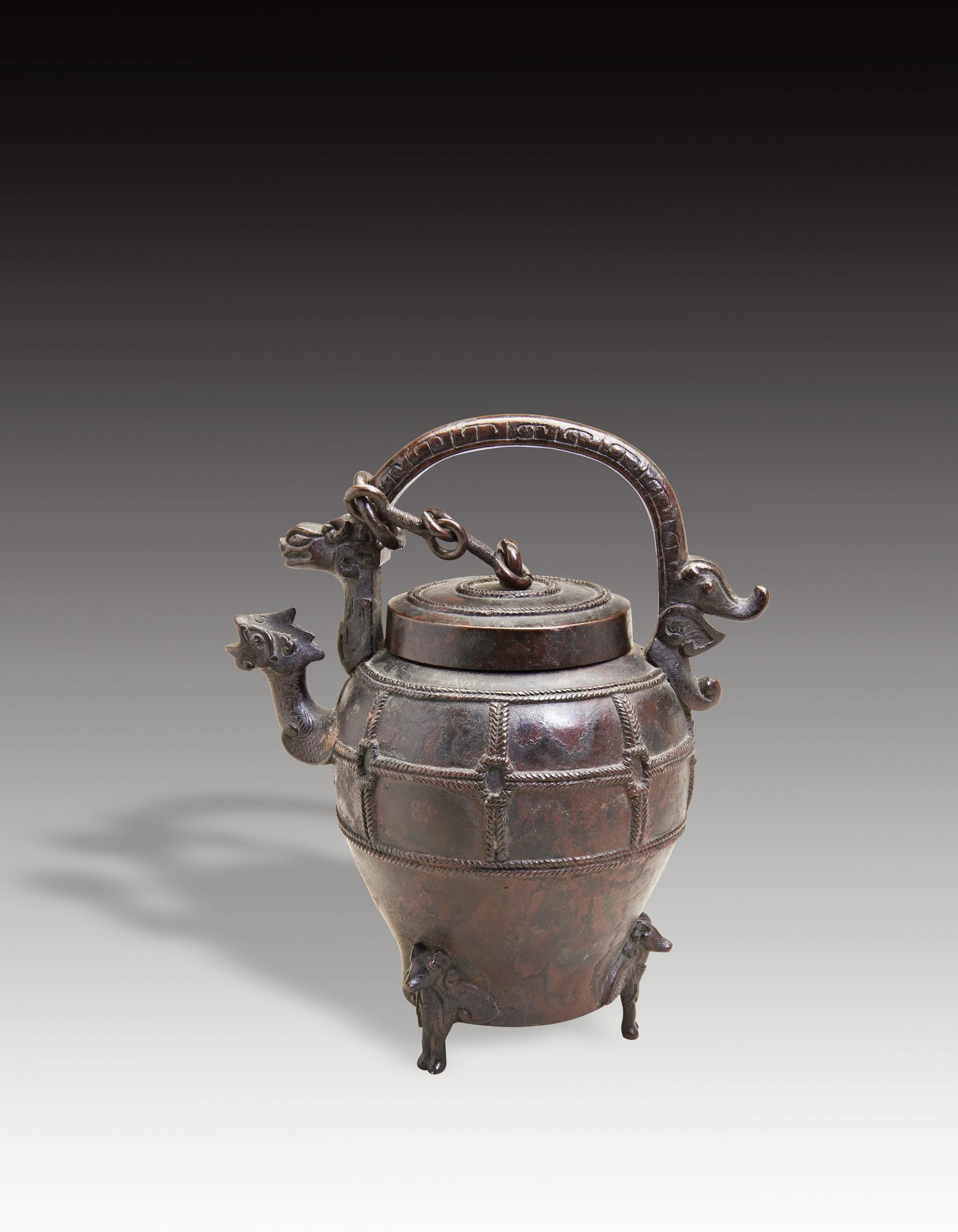 明 兽首绳纹青铜盉 in the Archaic-style, the baluster body cast with simulated rope tied bindings, with a mythical beast spout and loop handle, all raised on three bat-form feet, bears two inscriptions, the first is on the interior of the cover “Wang Xing commissioned (or made himself ) this precious He vessel, to bless his family and descendants’, the second is the interior of the base ‘This precious He vessel, made in Chang’an, for temple Cheng Third year of Jianping, month ten (Western Han, BC 4), Wangxing commissioned (or made by himself ) 21 5cm high