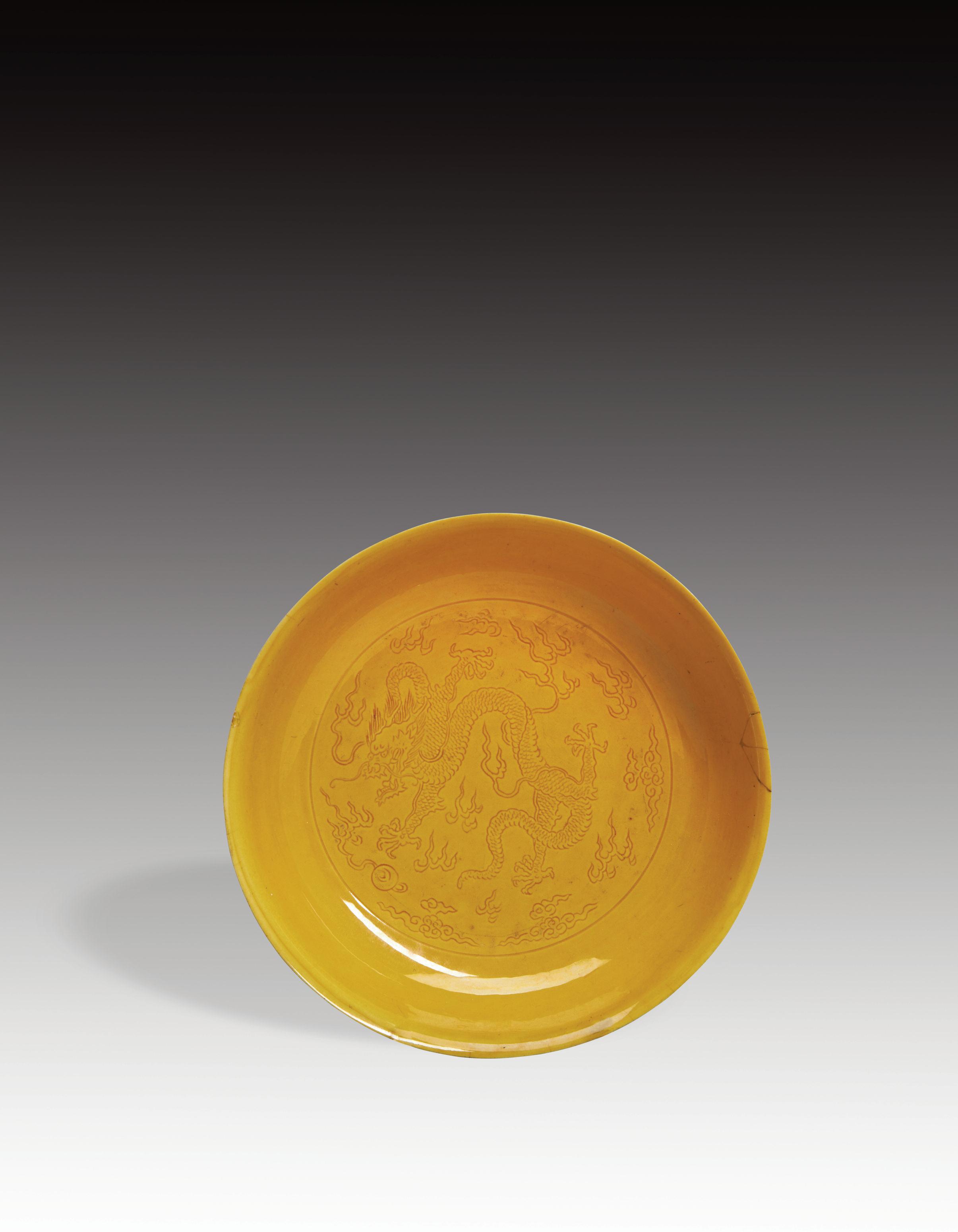 AN INCISED YELLOW-GLAZED ‘DRAGON’ DISH