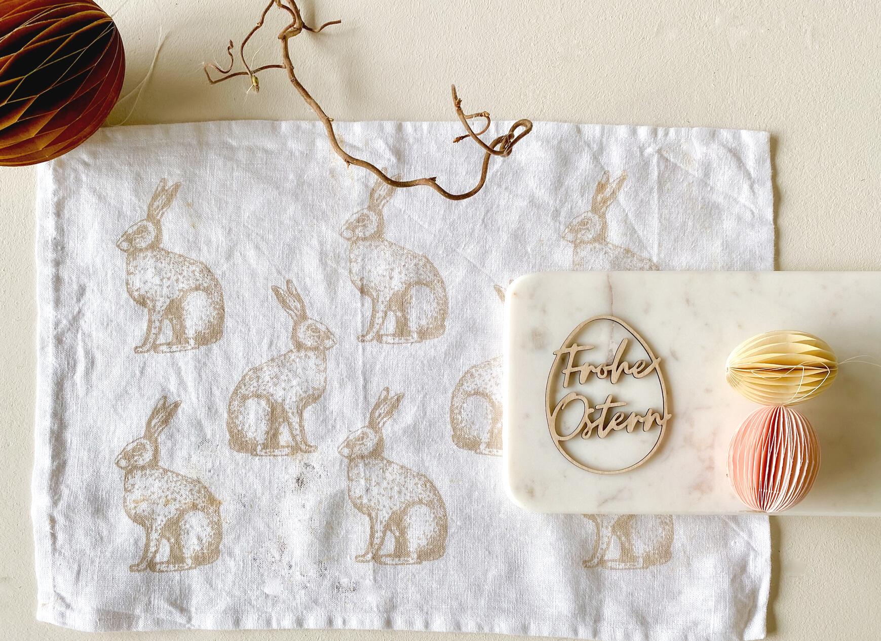 Feines Leinen und schönes Papier sind unsere Grundlagen Frühlingshafte Farben, hübsche Hasen und zarte Kränze zieren Geschirrtücher, Kissen und Grußkarten