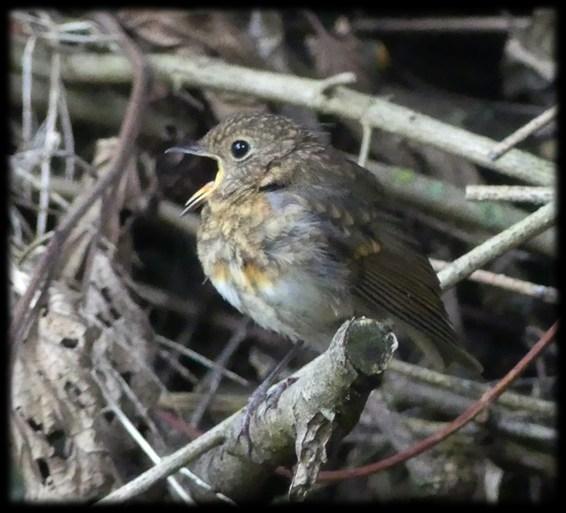 De jonge vogels hebben nog geen rode borst, maar zijn bruin gevlekt.